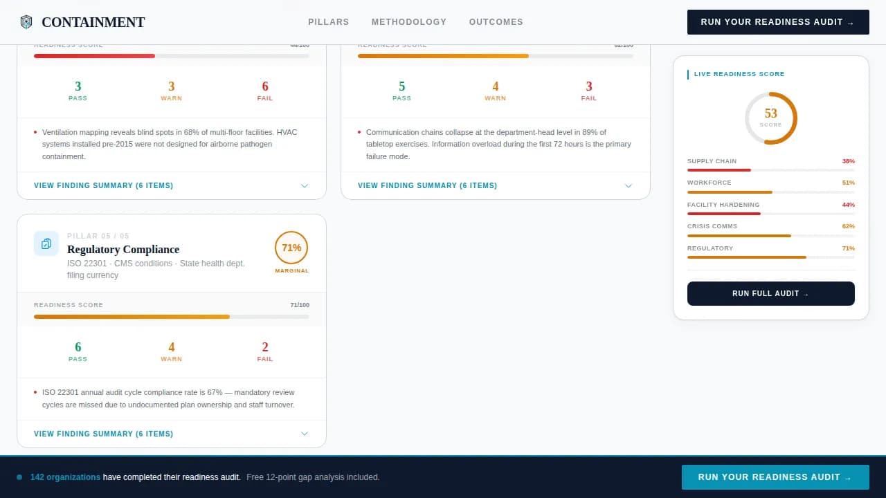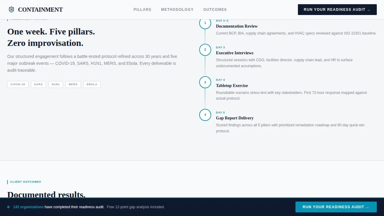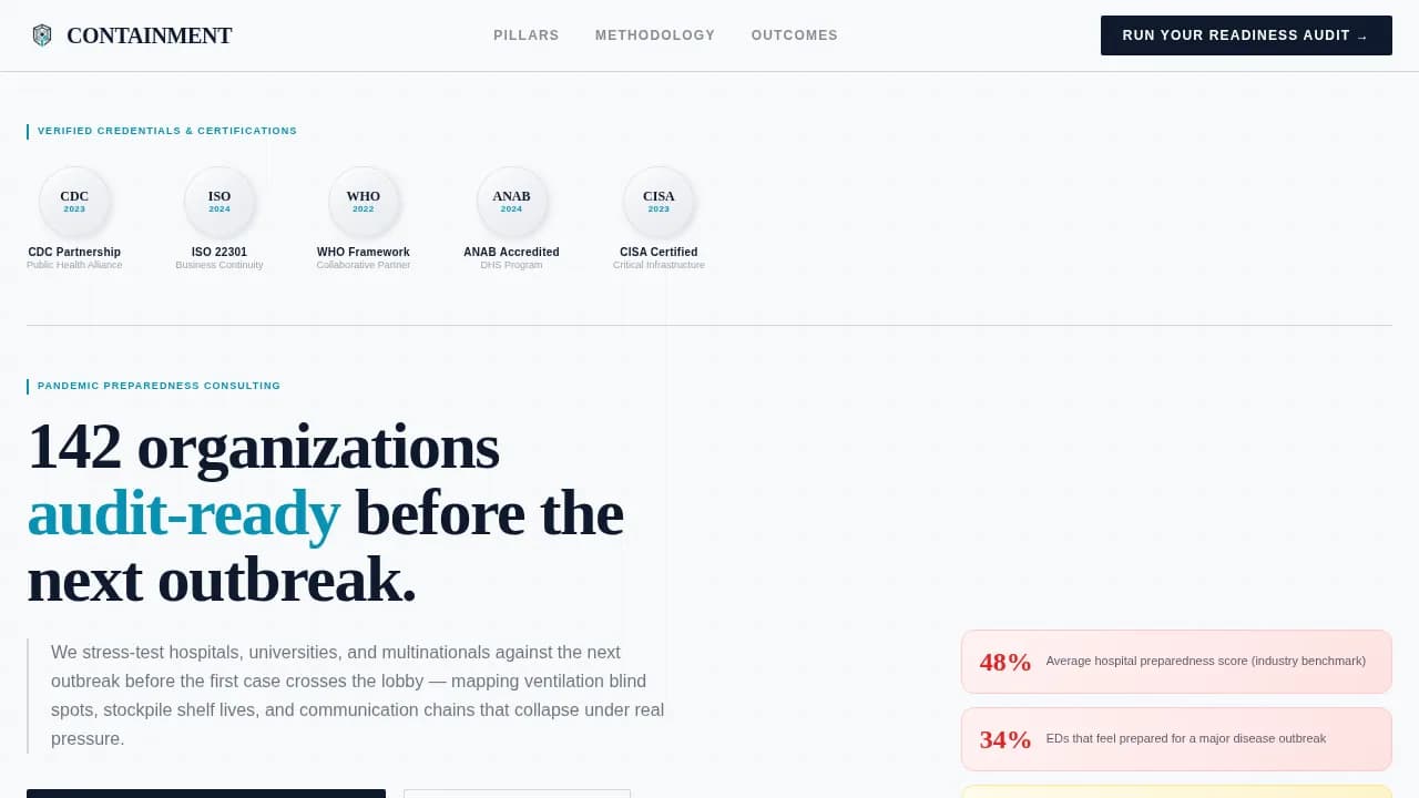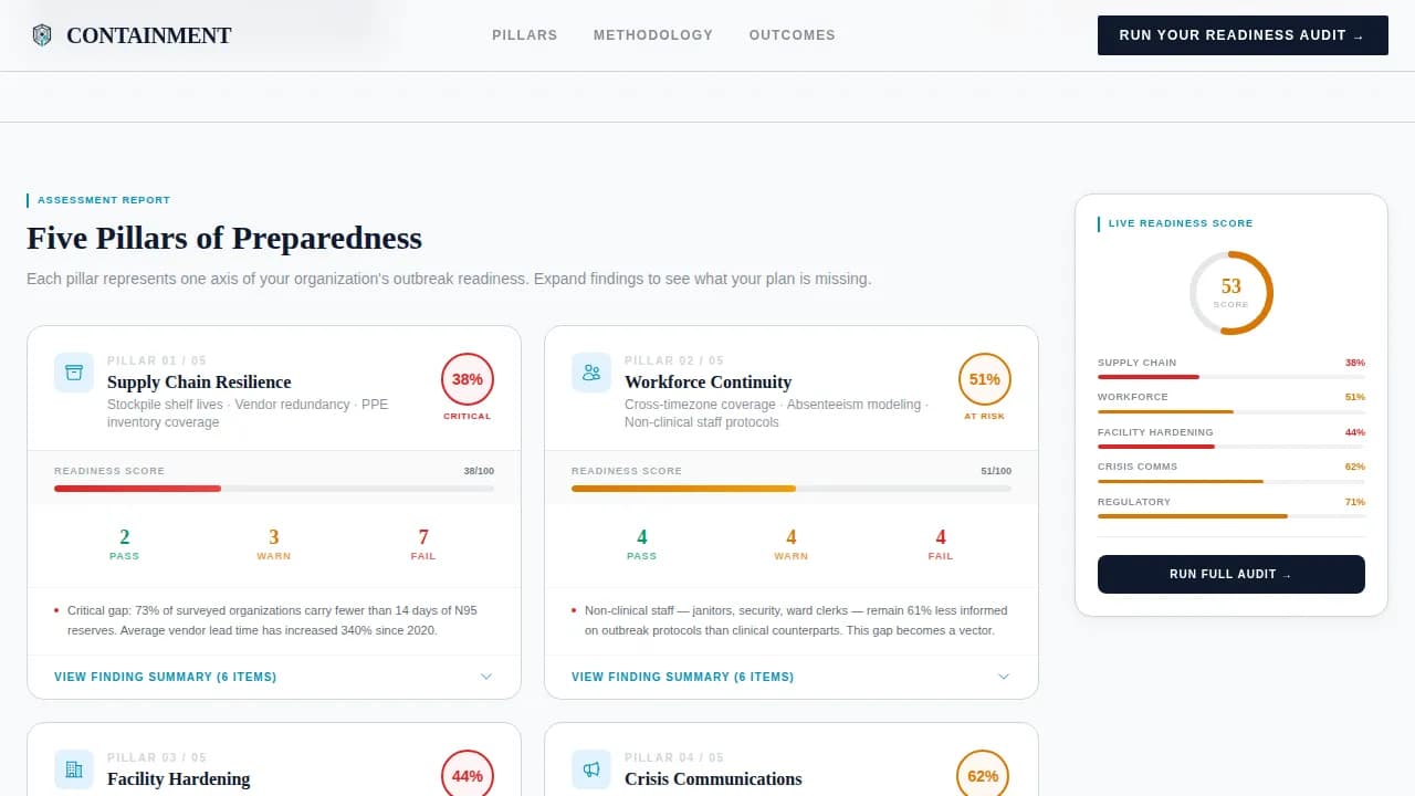 Containment is a single-page, card grid landing page template designed for pandemic preparedness consulting firms. It surfaces five audit pillars as modular scorecards, manufactures urgency through a live readiness score tracker, and drives visitors toward a diagnostic intake with a clear primary call to action. Every section feels like a page from a sealed emergency binder.