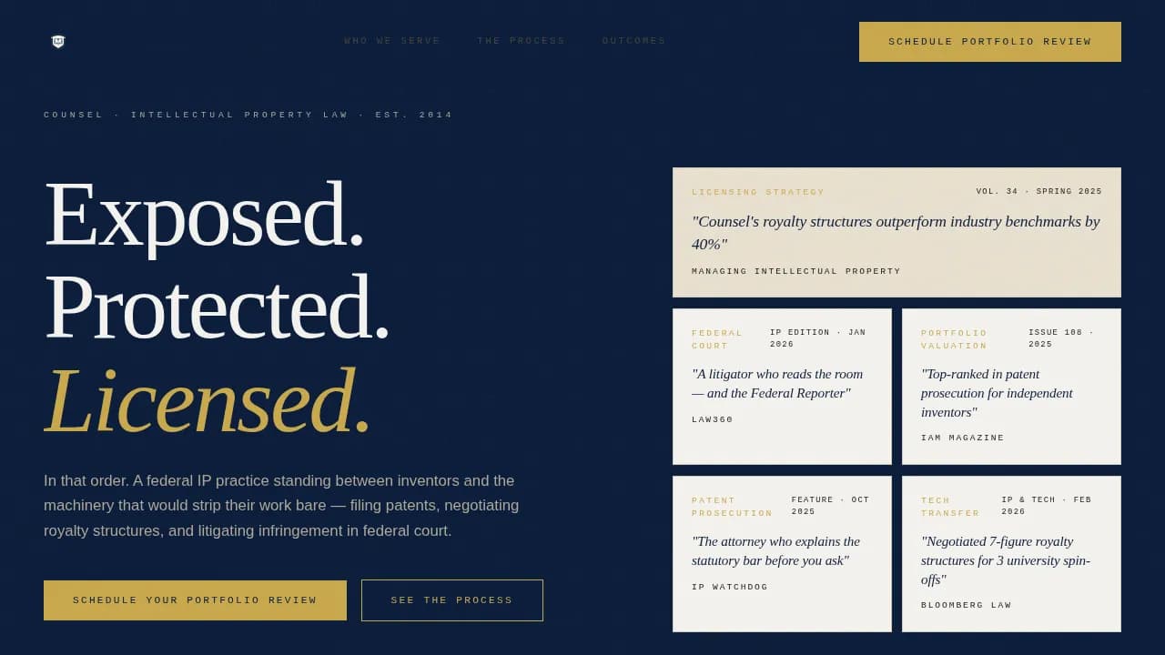 Counsel is a single-page, editorial-format lawyer landing page template designed for IP licensing attorney practices. It opens with a staggered press mention grid, guides visitors through five numbered engagement phases, and closes with a sequential booking form. The design draws from federal courthouse aesthetics: deep navy, cream content panels, and gold used sparingly on calls to action and pull quotes.