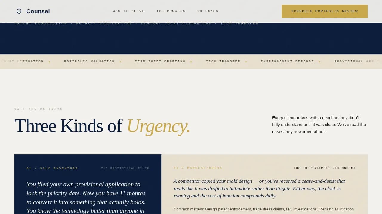 The "Who We Serve" section uses three panels of varying sizes rather than a uniform grid. Each panel represents a distinct client type: the solo inventor, the mid-size manufacturer, and the university tech-transfer office. This asymmetric layout signals that the firm understands the difference between each situation rather than treating all IP matters as identical. These panels function as trust signals that speak directly to the specific concerns each client type carries into a first consultation.