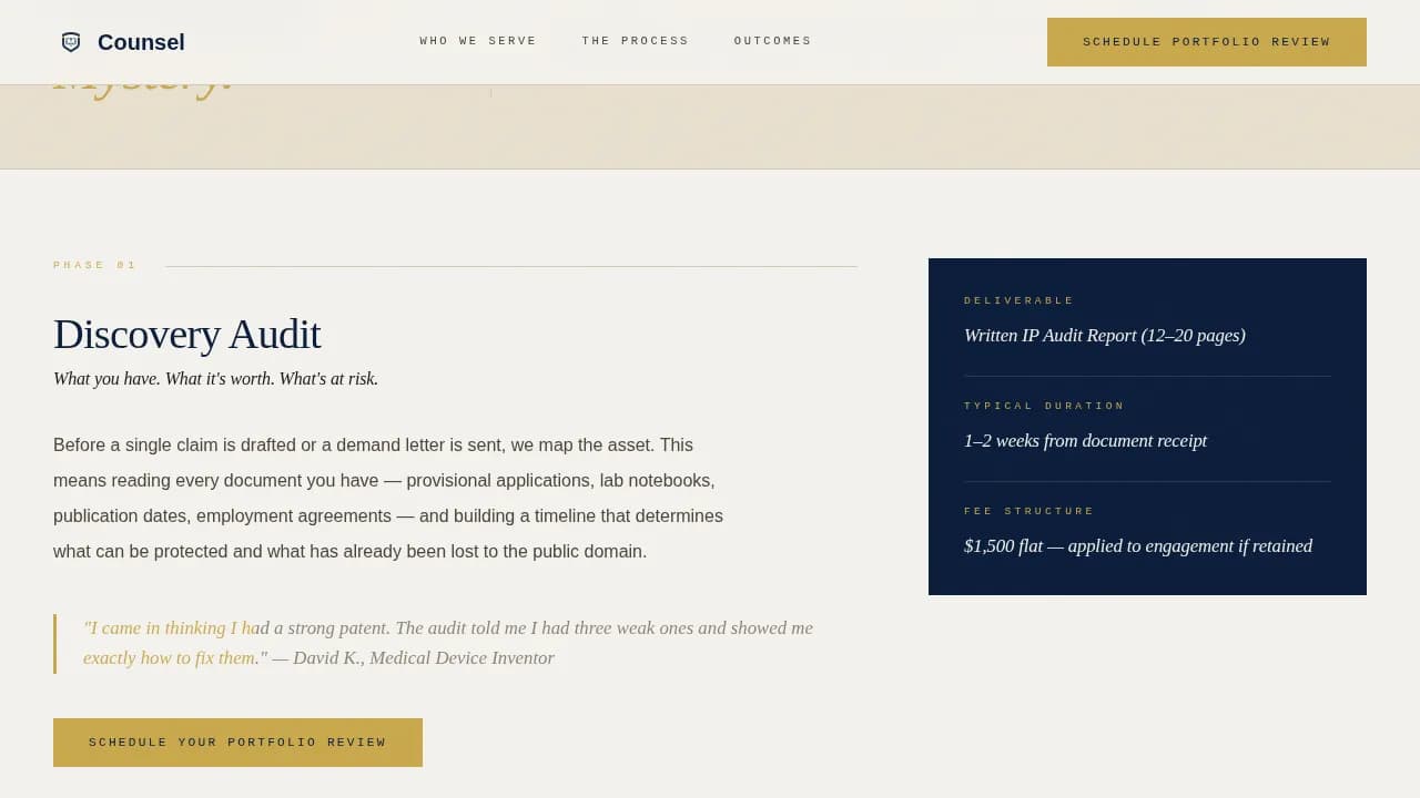 Every structural decision in this template is made with one goal: turning a skeptical IP owner into a booked consultation. The page does not ask visitors to trust the attorney blindly. It shows them exactly what working with the firm looks like, phase by phase, before the call to action appears. This builds the kind of trust that makes booking feel like the logical next step rather than a risk.