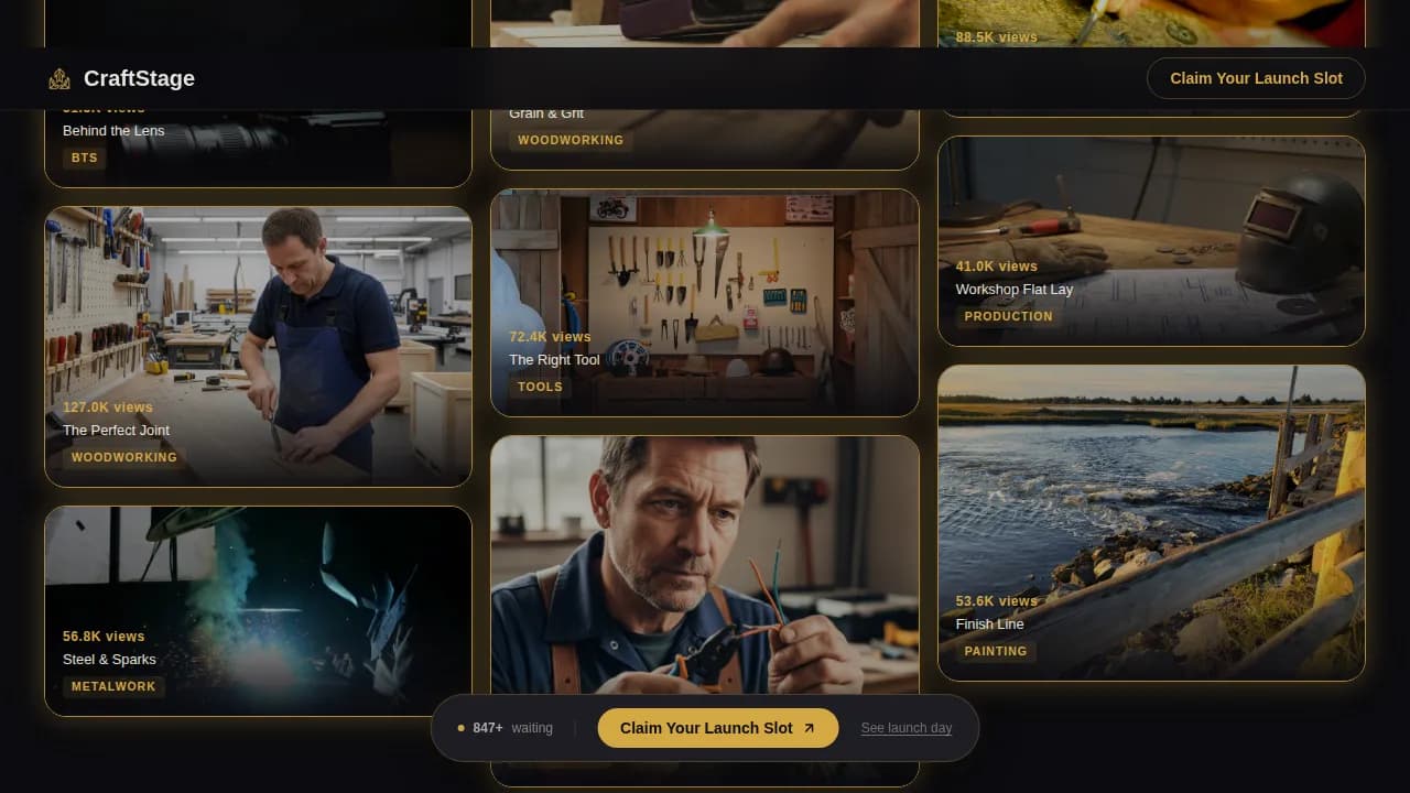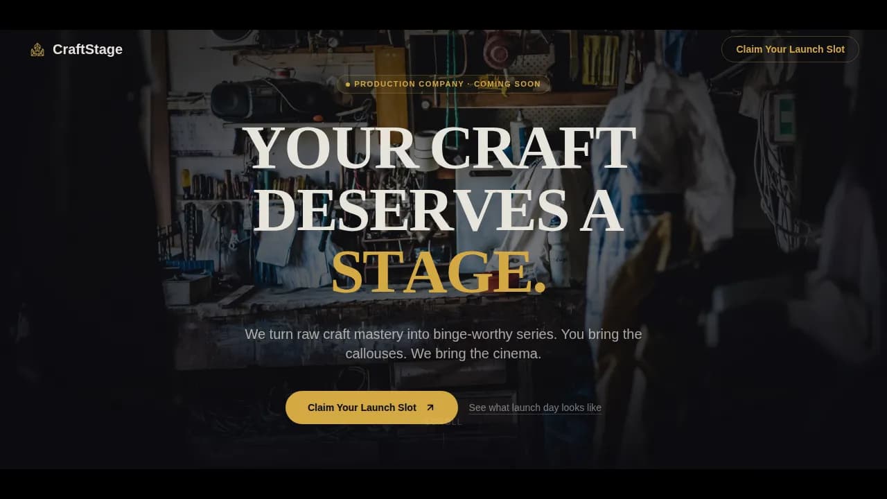 The Craftstage Cinematic Launch Spotlight DIY Channel Production landing page template is built for production companies serving skilled tradespeople and DIY creators. It pairs a cinematic Obsidian and Gold design with scroll-triggered card ignition, a floating waitlist bar, and a live counter to turn every page visit into a high-pressure launch event that converts visitors into early signups.