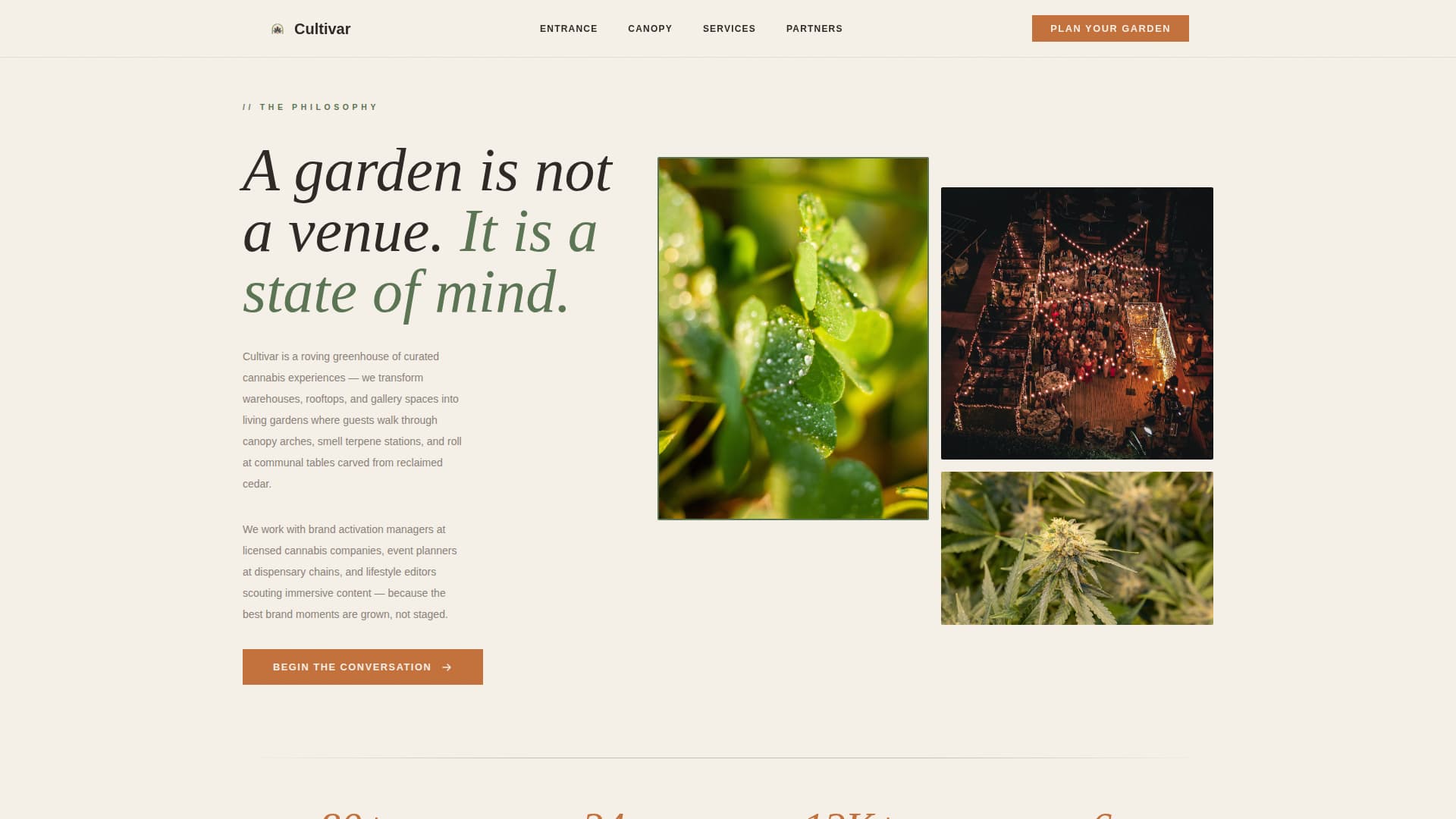 Cultivar is a full-width immersive landing page template for cannabis pop-up and experiential event companies. It guides visitors through a spatially layered scroll experience, from a cinematic hero shot to a service reveal and a lead generation form, converting brand activation managers, event planners, and lifestyle editors into qualified inquiries before ever asking for contact details.