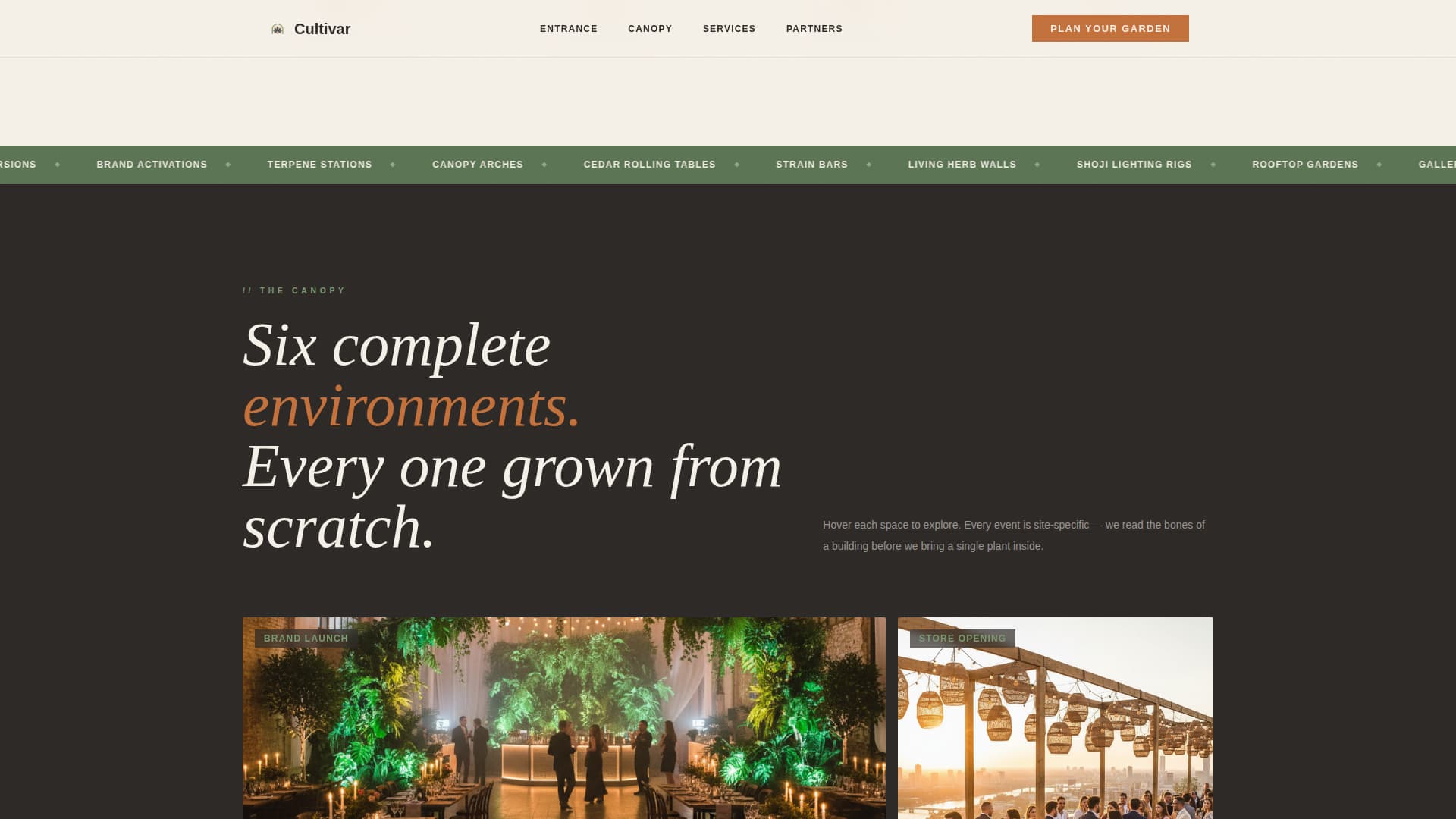 Most cannabis event pages lead with a form or a price list before earning any trust. Cultivar solves this by letting the environments do the selling first. Visitors experience the full scope of what the company creates before a single field appears.