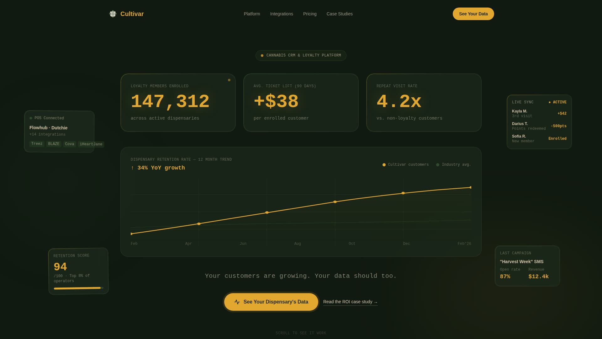 The full-viewport header displays live-style counters ticking upward in trichome amber against a deep loam background. Numbers like loyalty member counts, average ticket lift, and repeat visit rates animate on load using CSS counter animations. A self-drawing line graph traces dispensary retention over time, making the data feel alive rather than static.