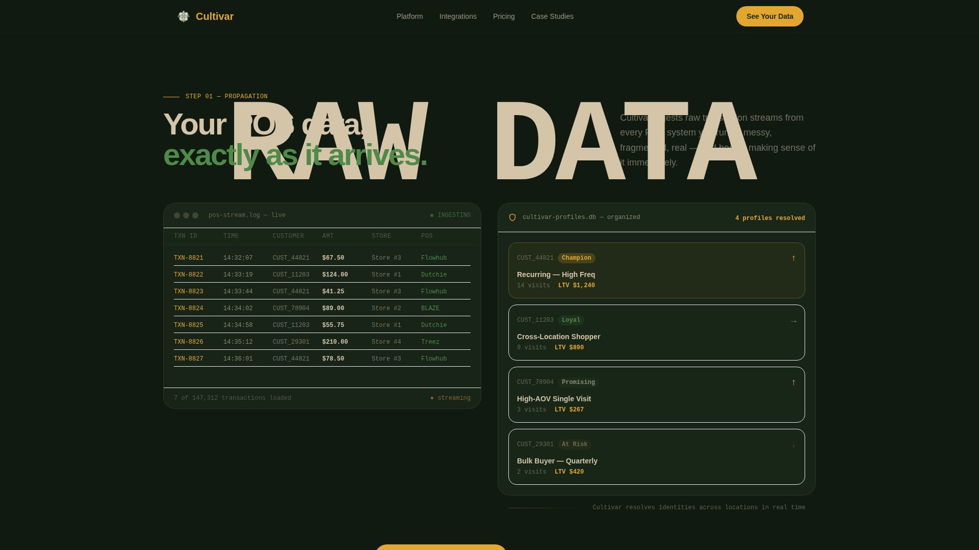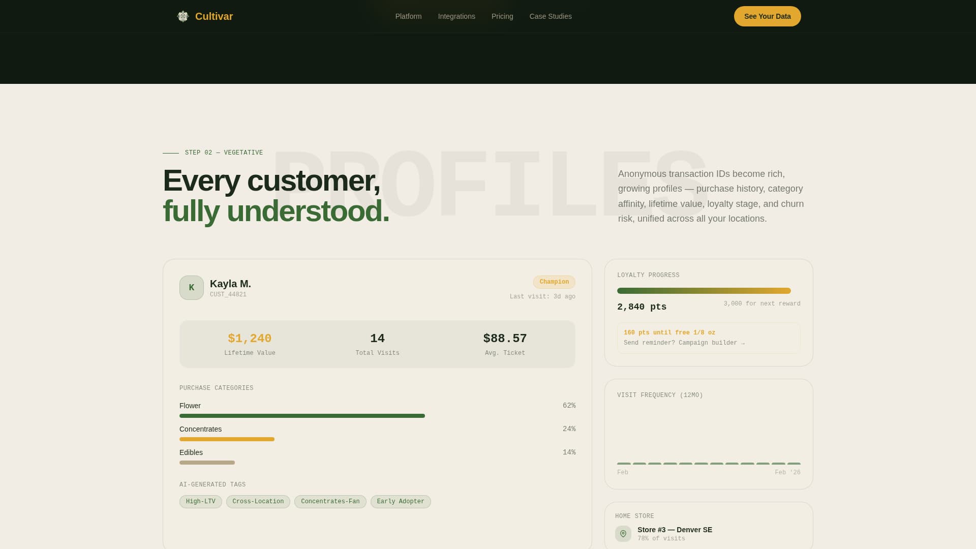 Dispensary operators face a real problem: fragmented data from multiple point-of-sale systems that never talk to each other. A generic landing page cannot close that gap. Cultivar solves the credibility problem by showing the platform working before ever asking for a sign-up.