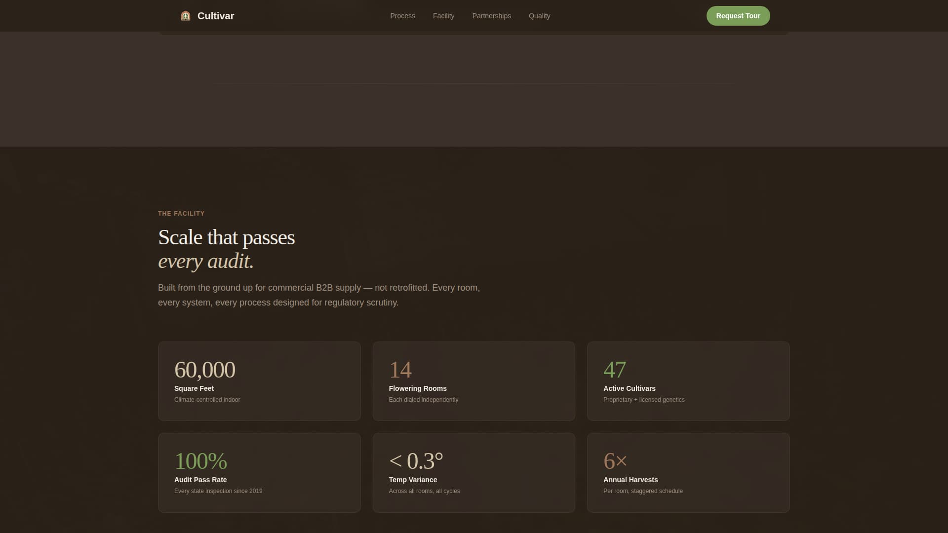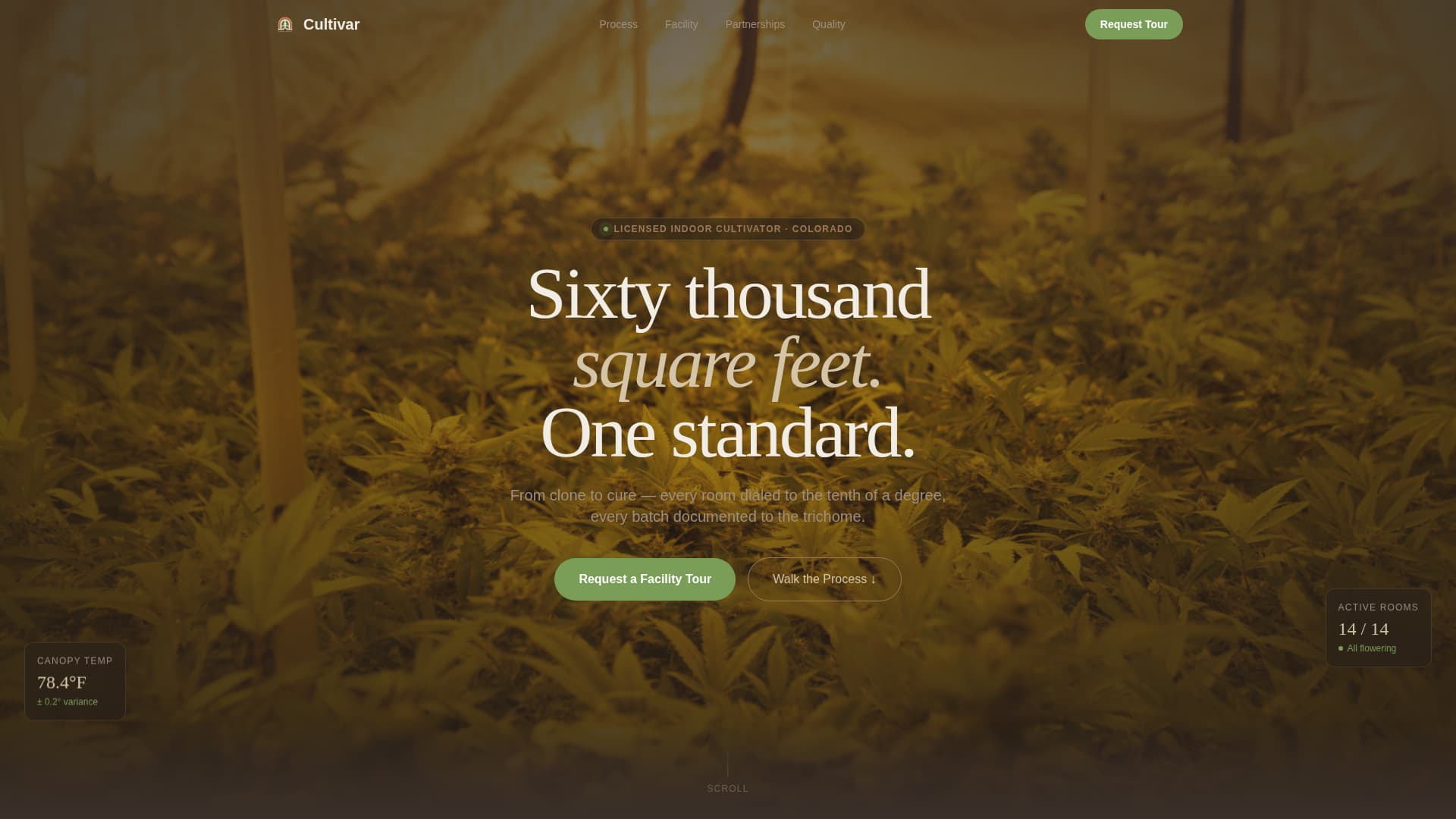 Cultivar is a single-page B2B template designed for indoor cannabis cultivators. It guides prospective partners through every stage of a cultivation run using expanding gallery cards, environment data panels, and lab result visualizations. By the time the tour request form appears, the visitor has already walked the full process.