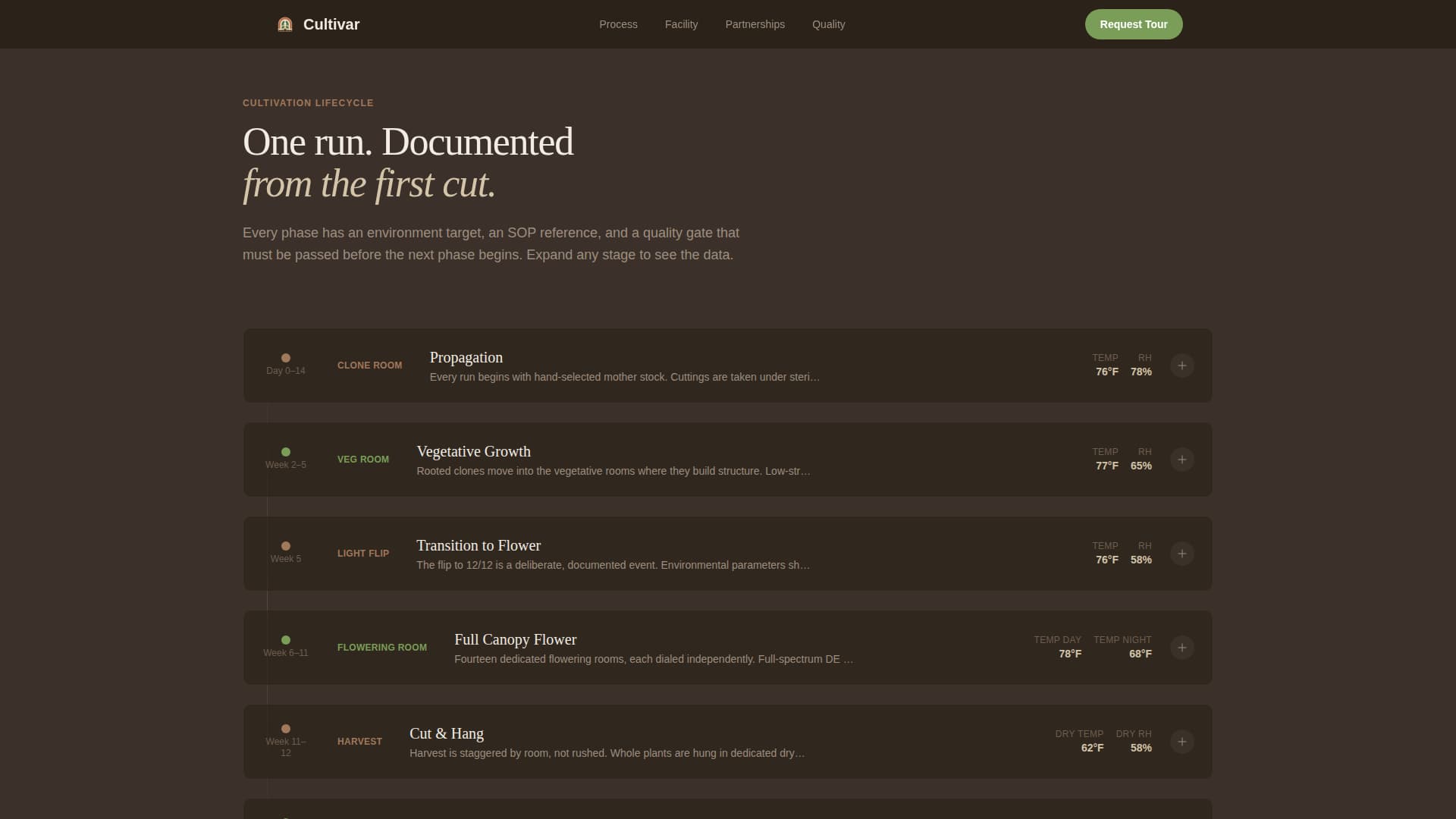 Gallery cards walk the visitor through each phase of a cultivation run: clone, vegetative, flower, harvest, dry, trim, cure, testing, and packaging. Each card expands into a detail panel showing environment data, referenced standard operating procedures, and the quality gate that must pass before the next phase begins.