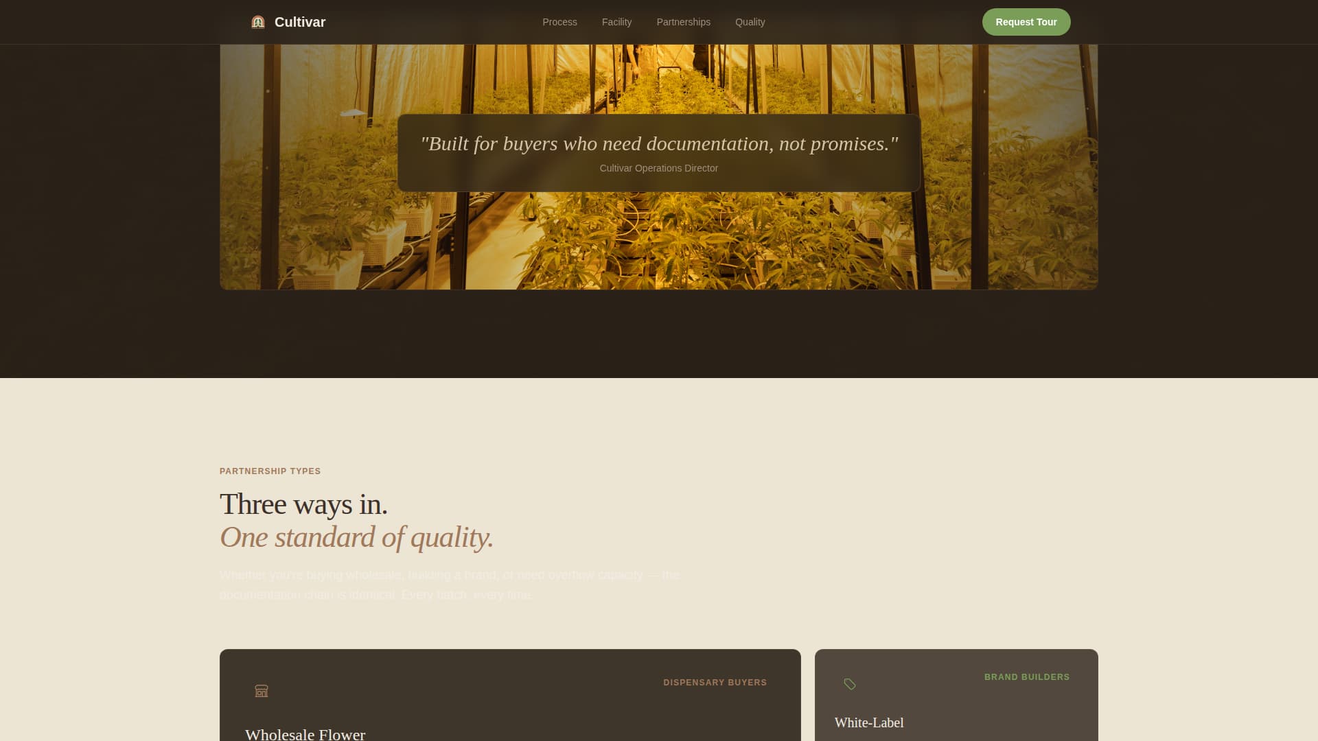 B2B cannabis buyers do not commit based on claims. They need documentation, process evidence, and a facility they can trust before they write a purchase order. Most cultivation pages lead with product photography and stop there.