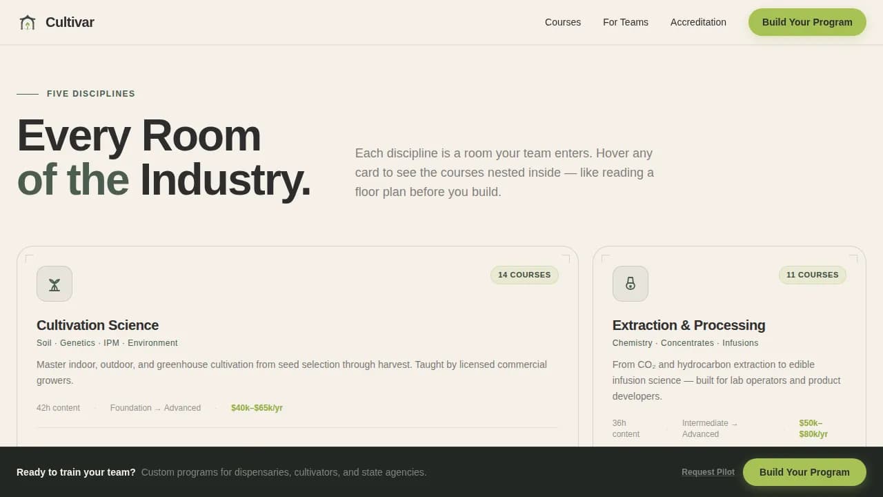 Cultivar is a professional cannabis education landing page template designed for institutional training programs. It presents five course disciplines as interactive floor-plan cards, guides prospects through a three-step form, and builds trust through partner logos and a live certified-professional counter. The design feels unhurried and deliberate, like a walled garden organized with purpose.