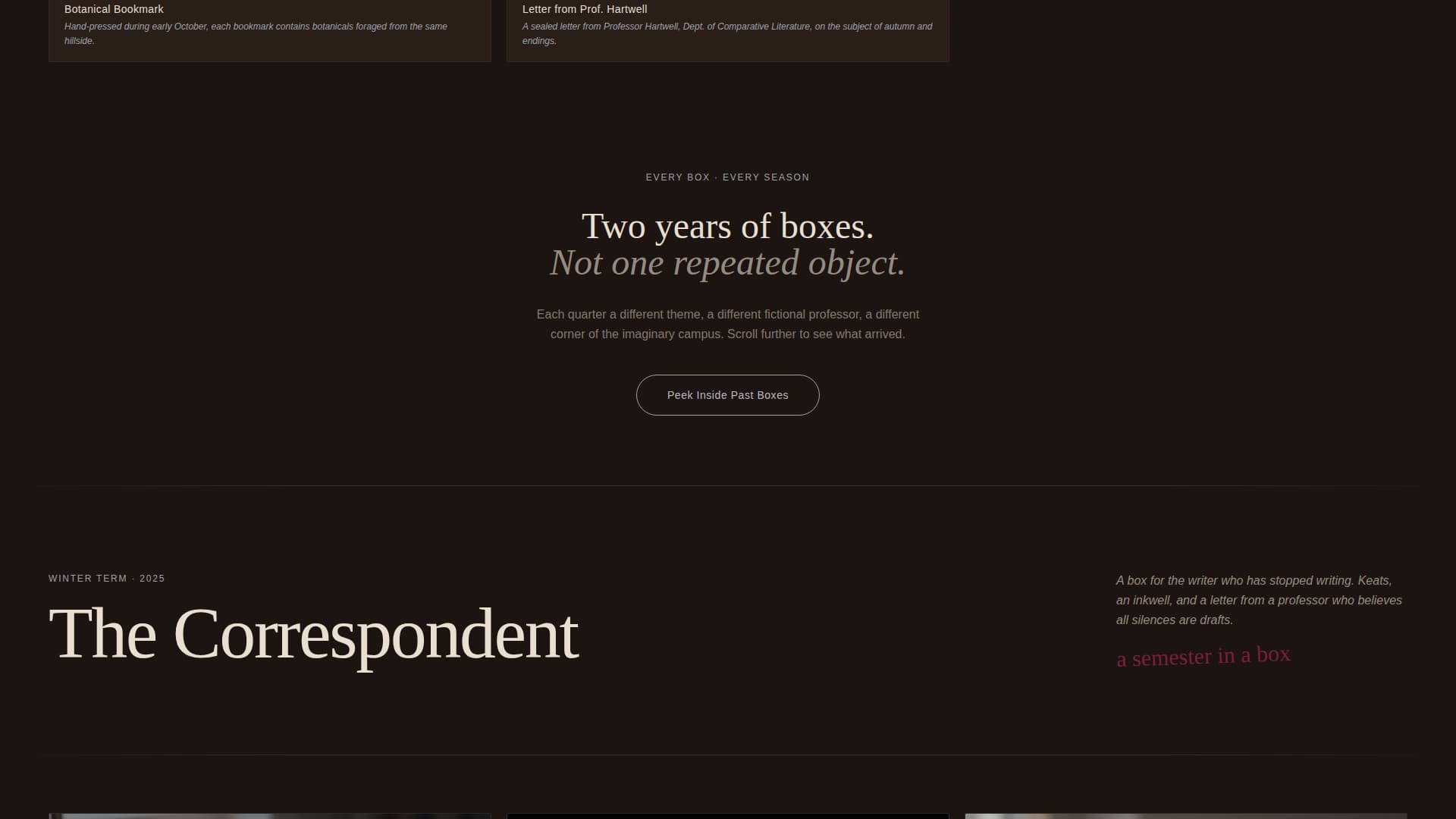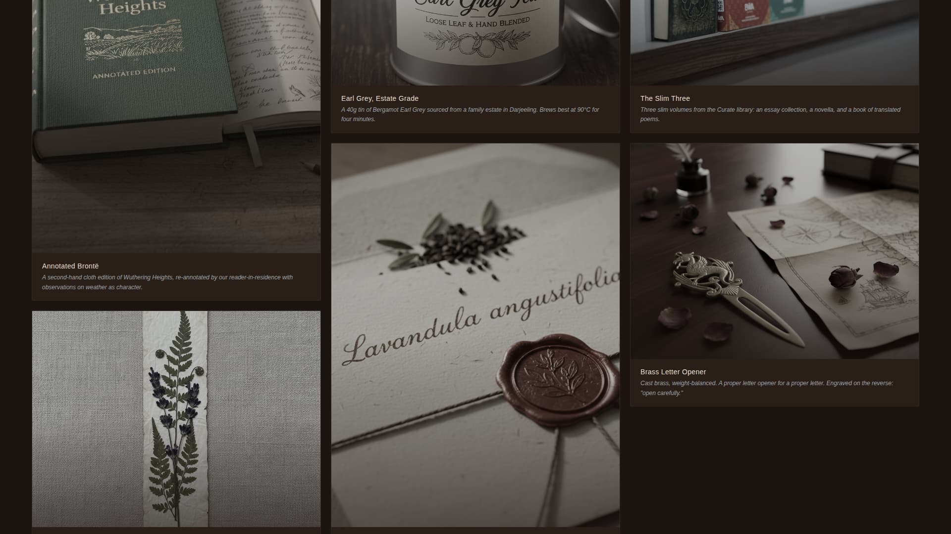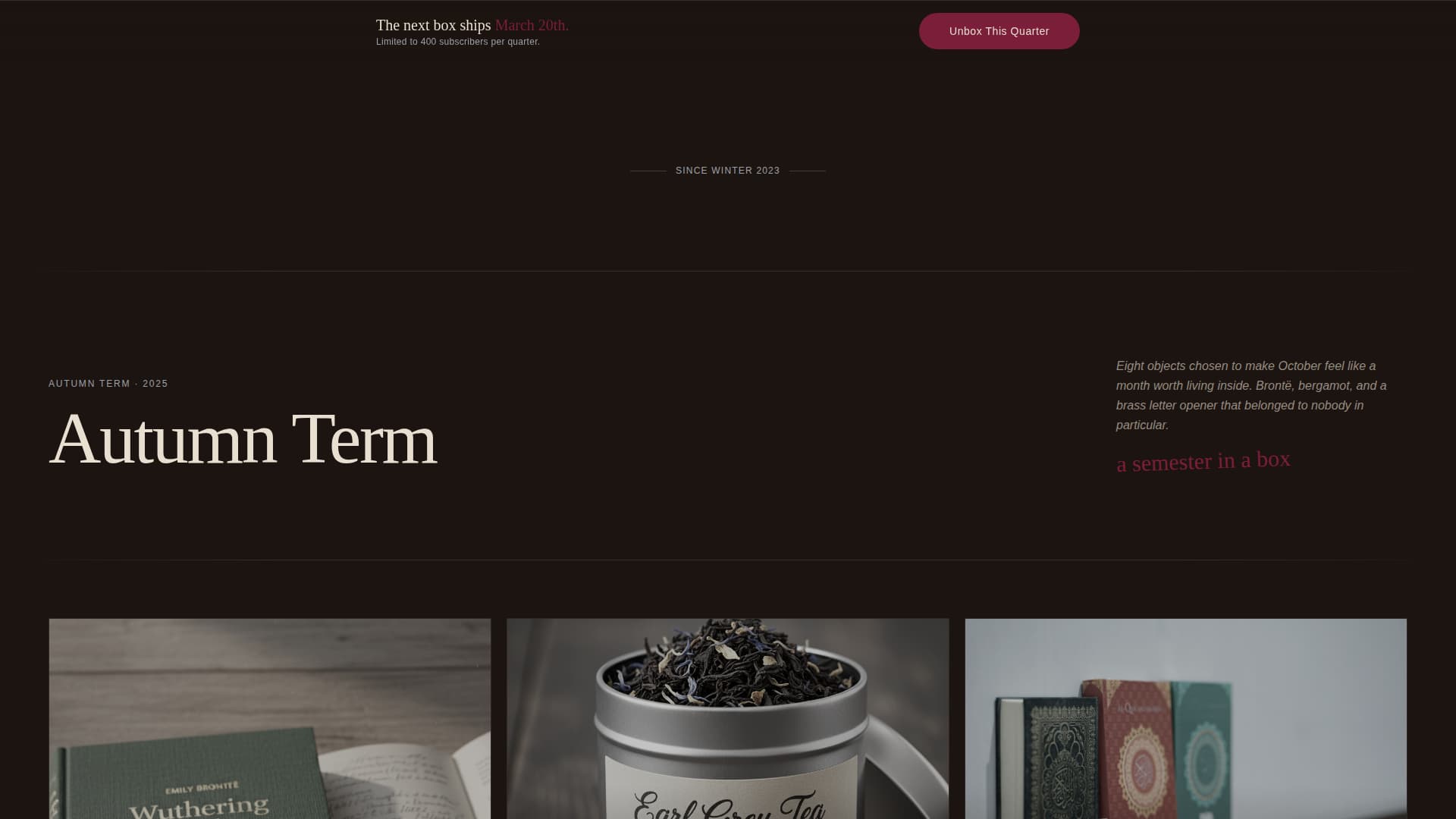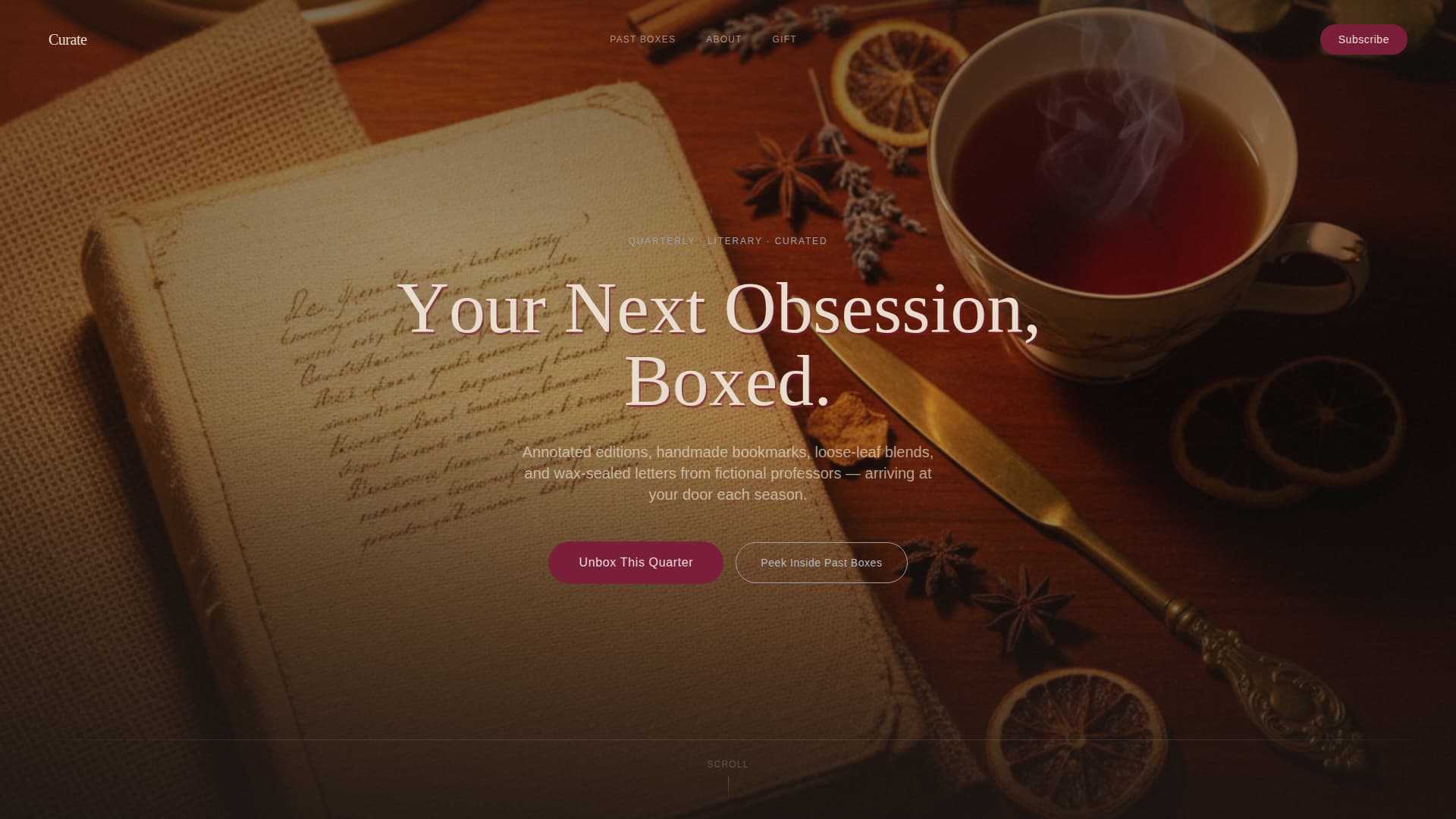 Curate is a single-page template designed for a quarterly light academia subscription box. It opens on a full-viewport desk photograph with a serif headline that fades in letter by letter. From there, a masonry gallery walk leads visitors through past box contents, building desire one curated artifact at a time, before a persistent call-to-action button closes the sale.