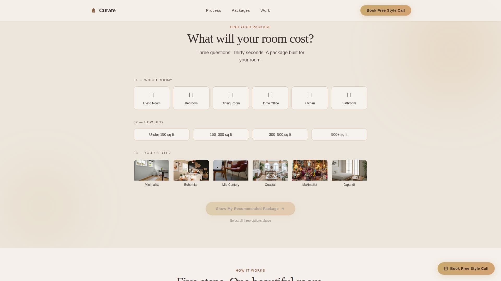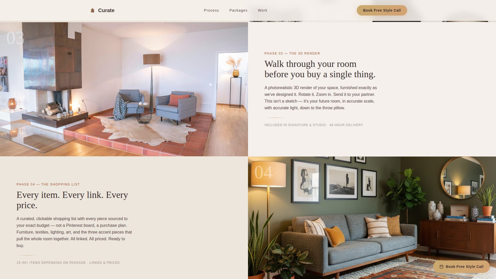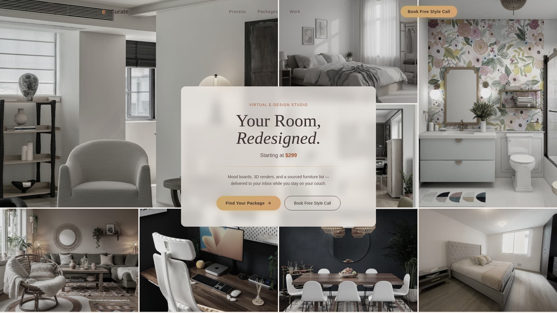 Curate is a luxe minimal landing page template built for e-design and virtual interior design studios. It opens with a nine-tile photo mosaic, flows into an interactive room budget estimator, and guides visitors through every design phase in a warm zigzag layout. The primary goal is booking free style calls, starting at $299.