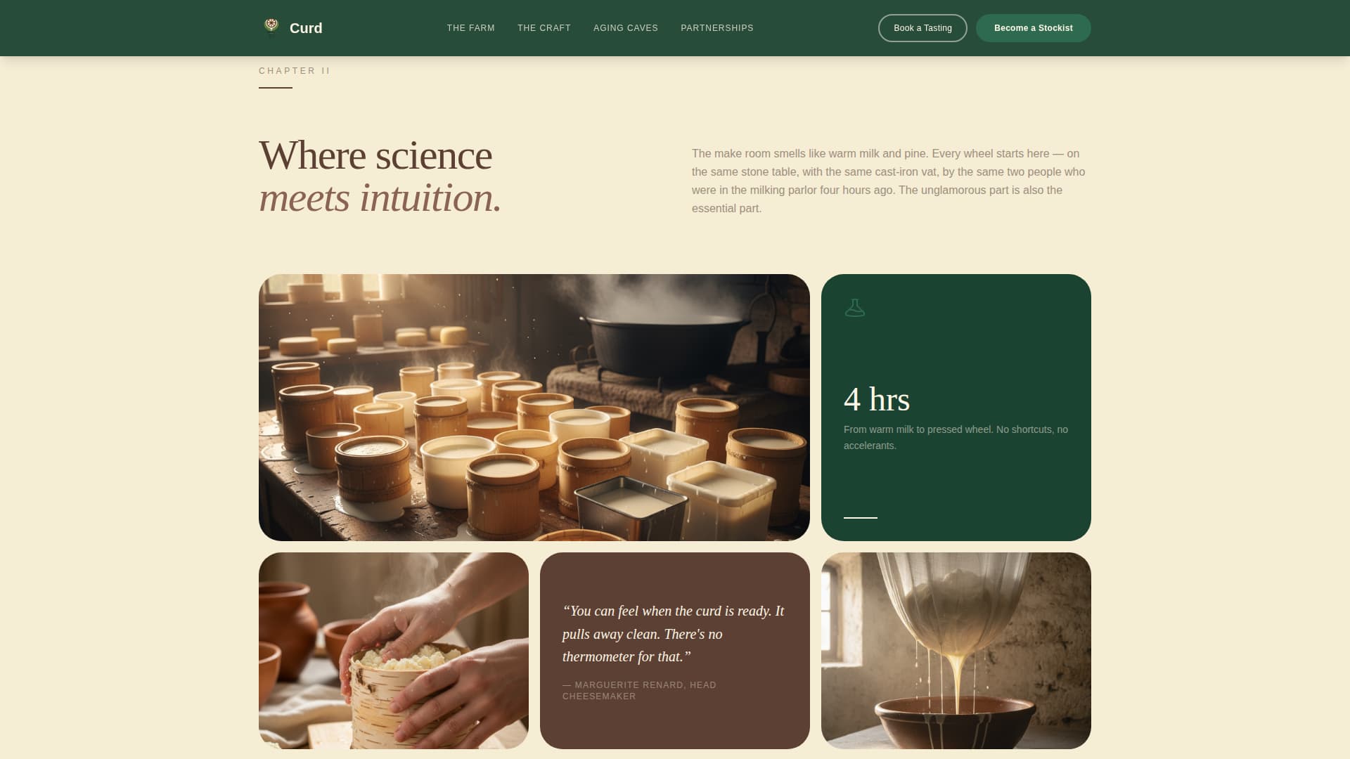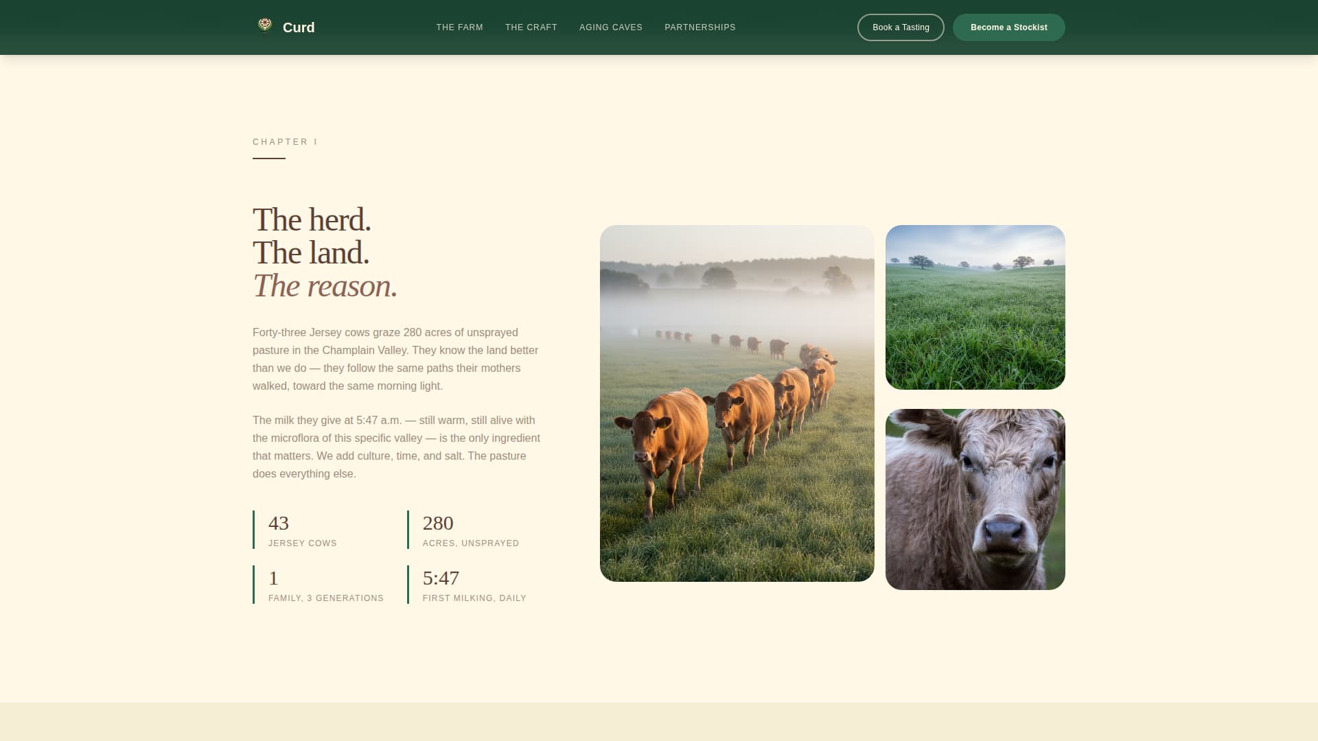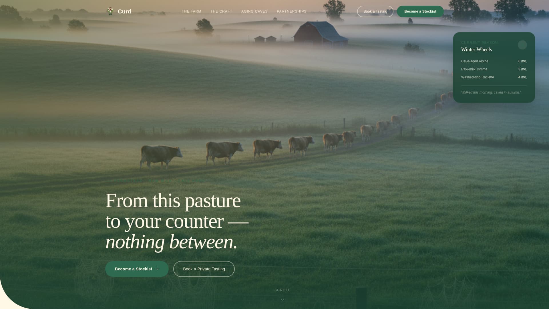 Curd is a landing page template designed for farmstead cheese makers who sell to trade buyers. It tells the full origin story, from herd to aging cave to the table, and converts visitors through two distinct paths: a wholesale stockist inquiry and a private tasting booking. The design feels like a printed farm journal brought to life on screen.