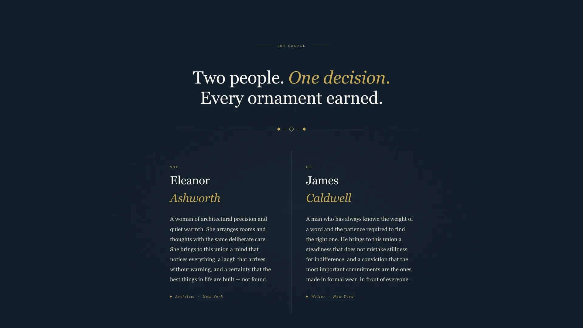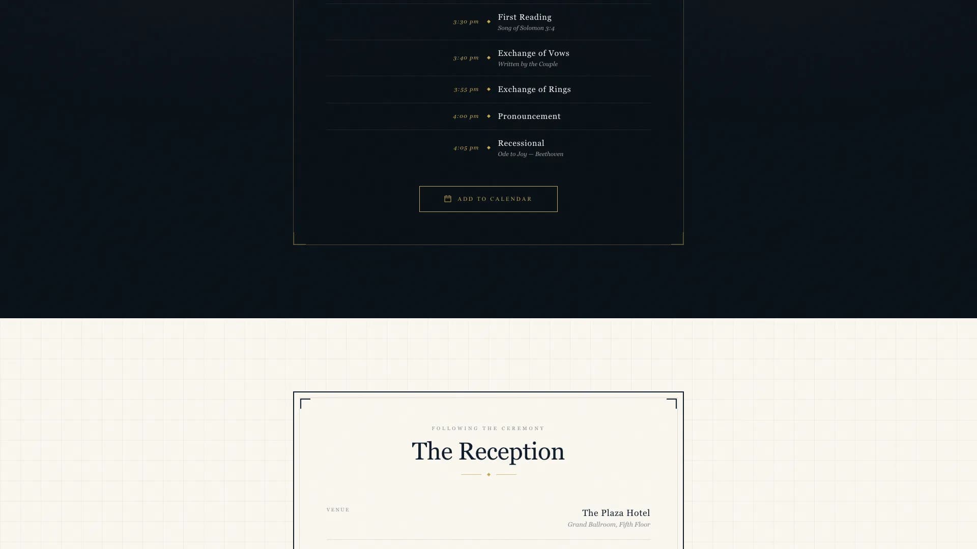 You get a full-viewport, section-led landing page with five distinct content areas. Each area is designed to carry specific wedding information with typographic precision. The combination of a high-contrast Art Deco serif for names and an elegant old-style serif for body text means every word feels engraved.