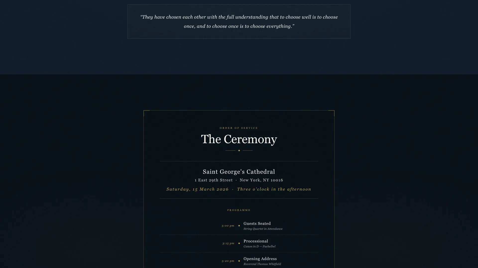 The ceremony section presents venue, time, and order of service as a typographic programme card. It reads like a printed insert from a formal event. The layout keeps architectural details visible without competing with the ceremony content.