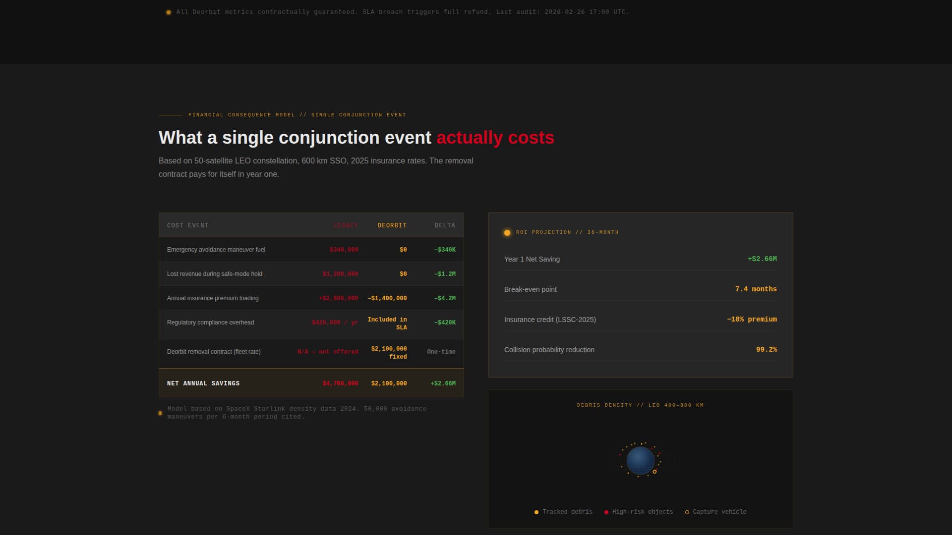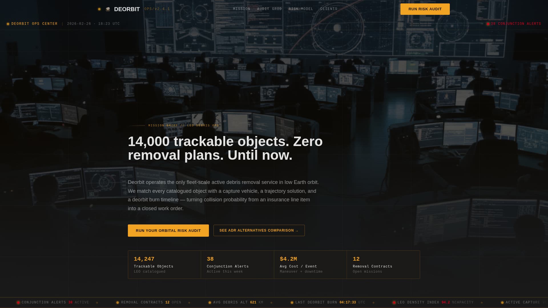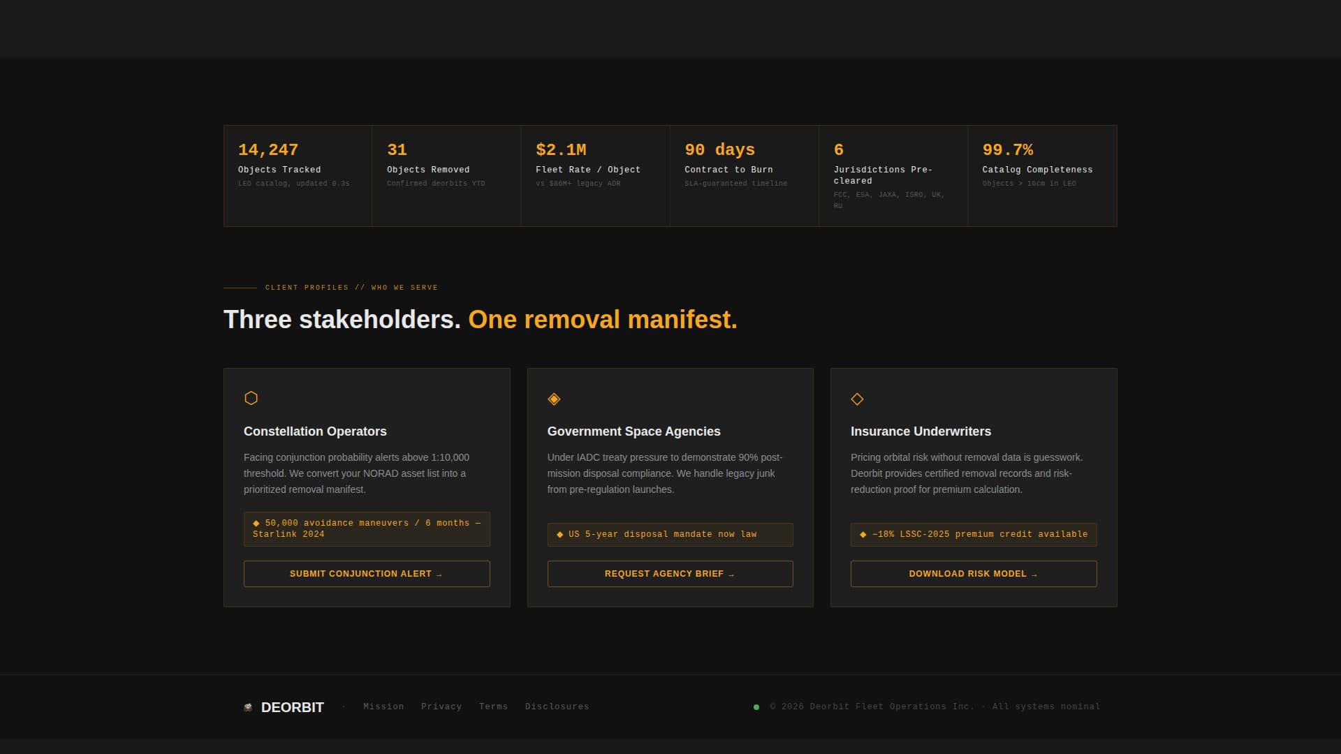 Deorbit is a single-page, data-command landing page template for a fleet operations company that removes dead satellites and spent rocket stages from low Earth orbit. The design channels a real mission operations center: dark panels, amber telemetry, and a structured audit grid that turns orbital risk into a clear business case.