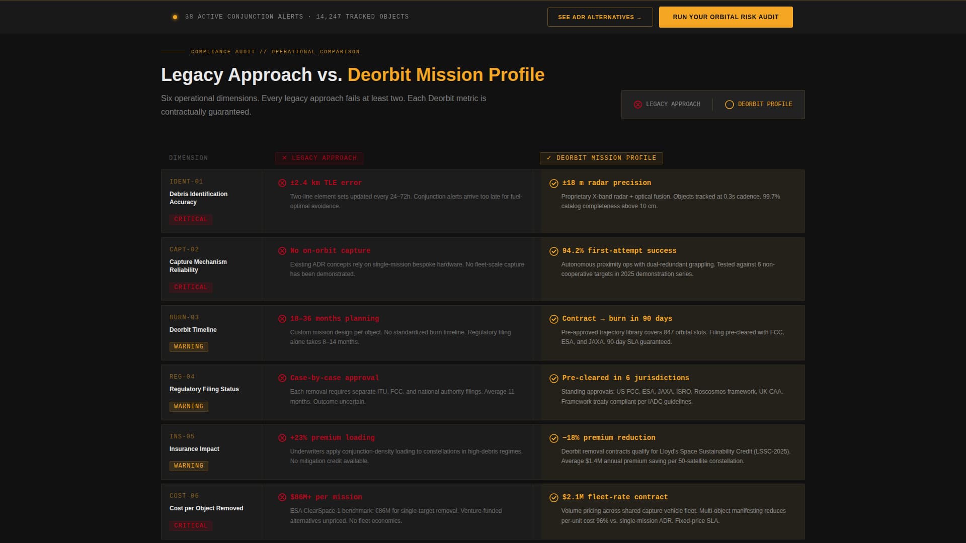 | Audit Grid Header | Labels the left Legacy Approach and right Deorbit Mission Profile columns |
