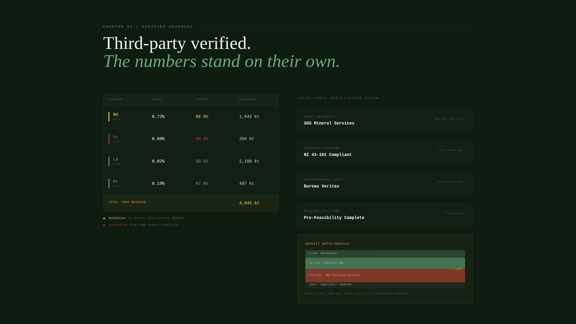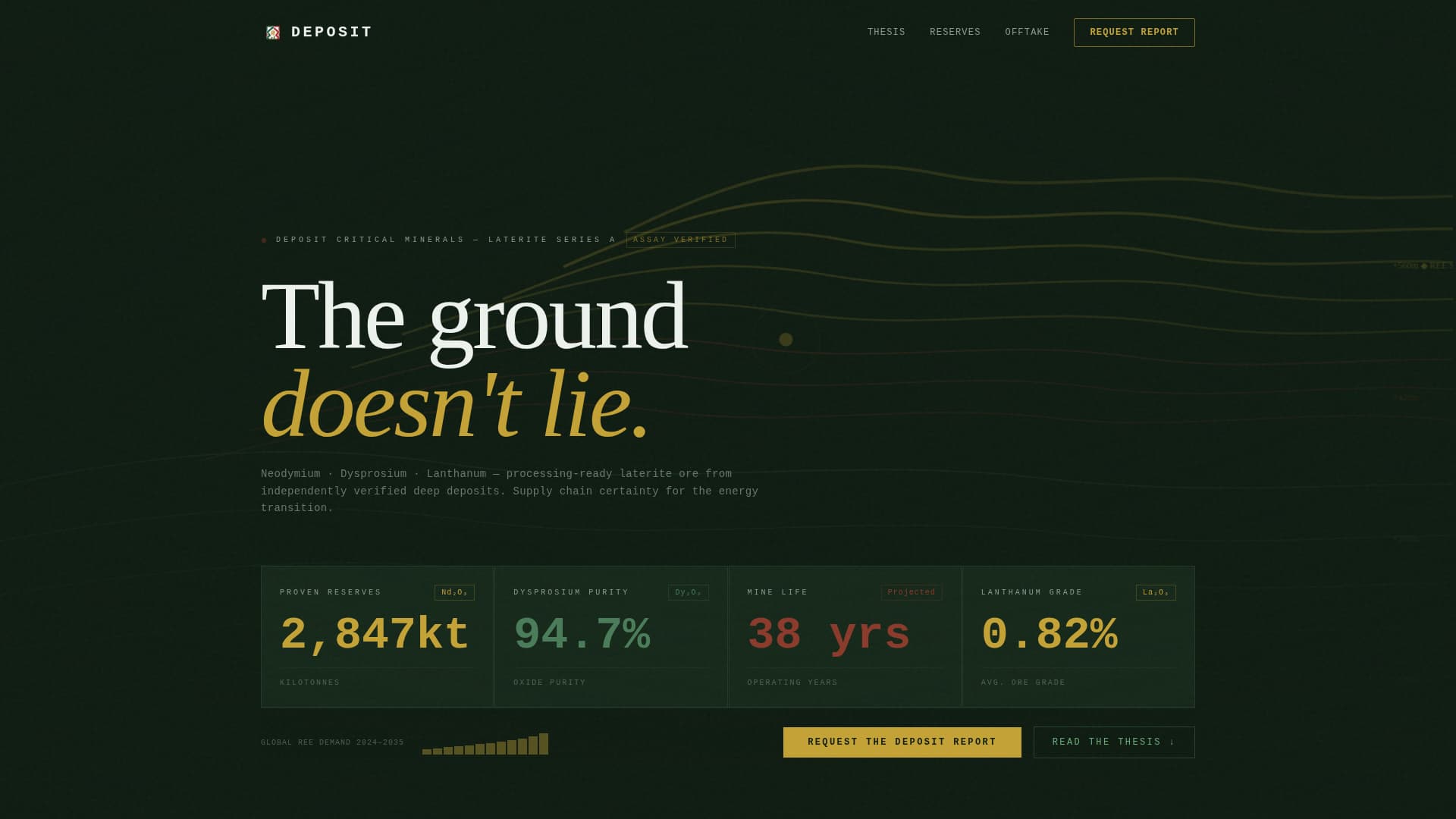 Deposit is a zigzag landing page template built for a rare earth mining operation producing neodymium, dysprosium, and lanthanum. It targets battery gigafactory procurement directors, defense supply chain officers, and sovereign wealth fund managers. The design uses a Data Command theme with a Forest Trust color palette and animated data storytelling to present reserve proof, supply chain context, and a gated B2B conversion flow.