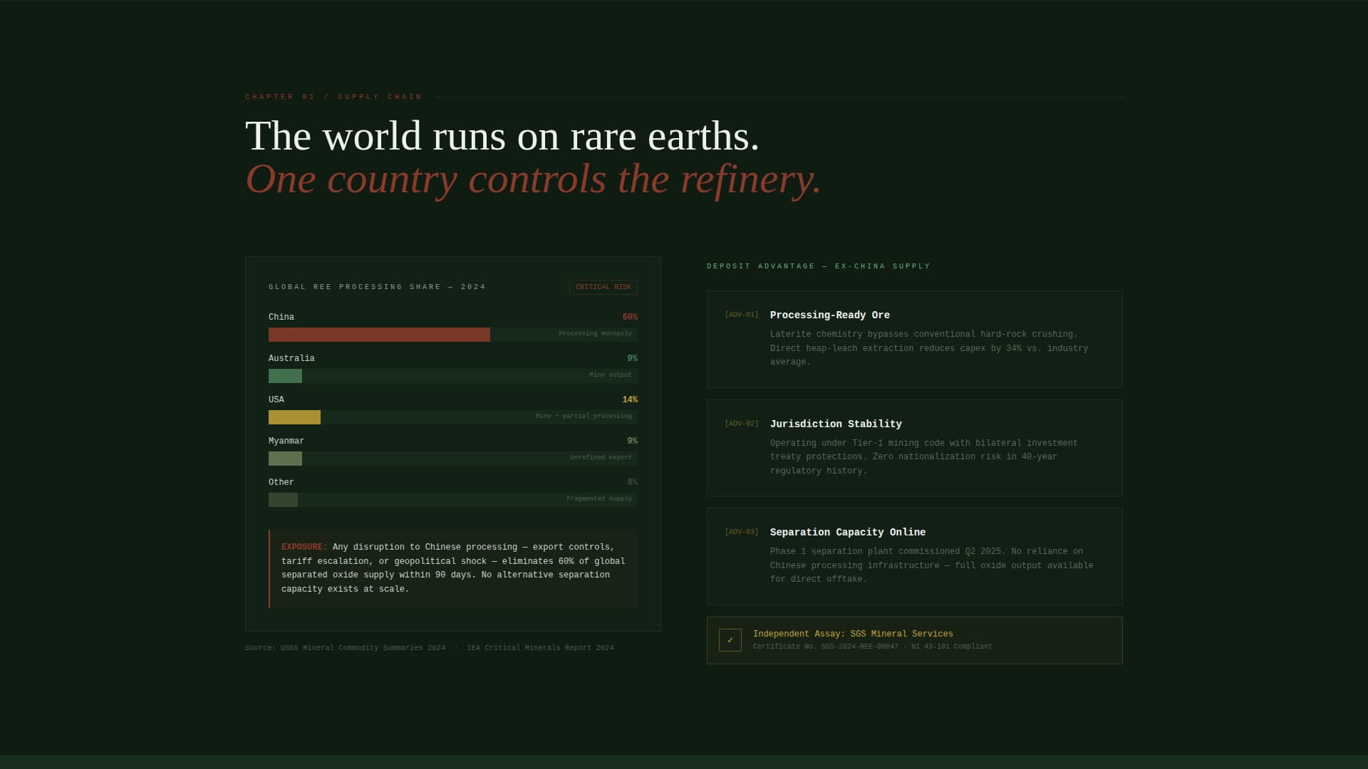 One dedicated zigzag section presents a supply chain map illustrating processing concentration and geopolitical risk. It contextualizes the problem before presenting the mine's processing-ready ore advantage as a direct response.