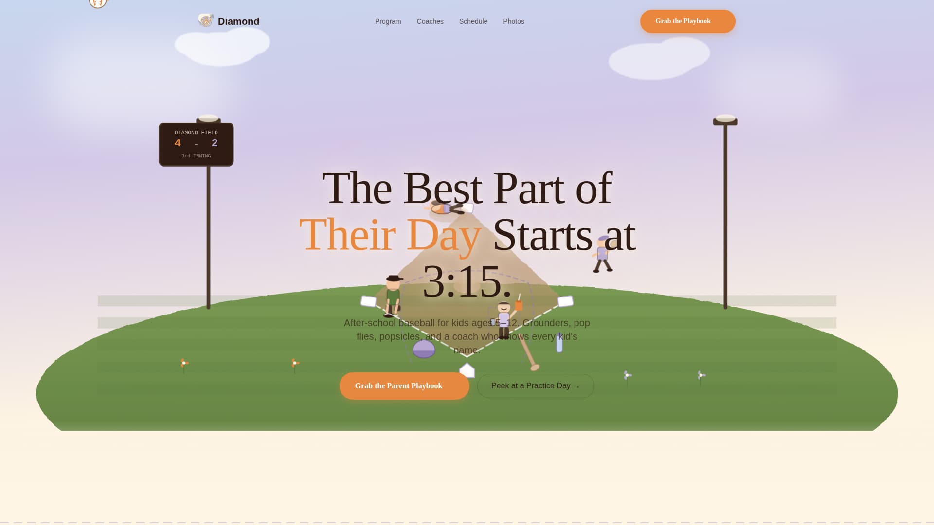 Diamond is a hero-dominant landing page template built for kids baseball after-school programs. It leads with a whimsical animated illustration, earns parent trust through personality-driven storytelling, and converts curiosity into signups with a two-field "Parent Playbook" email capture form. The design blends soft lavender, warm cream, and home-plate orange into a page that feels like summer evenings on the field.