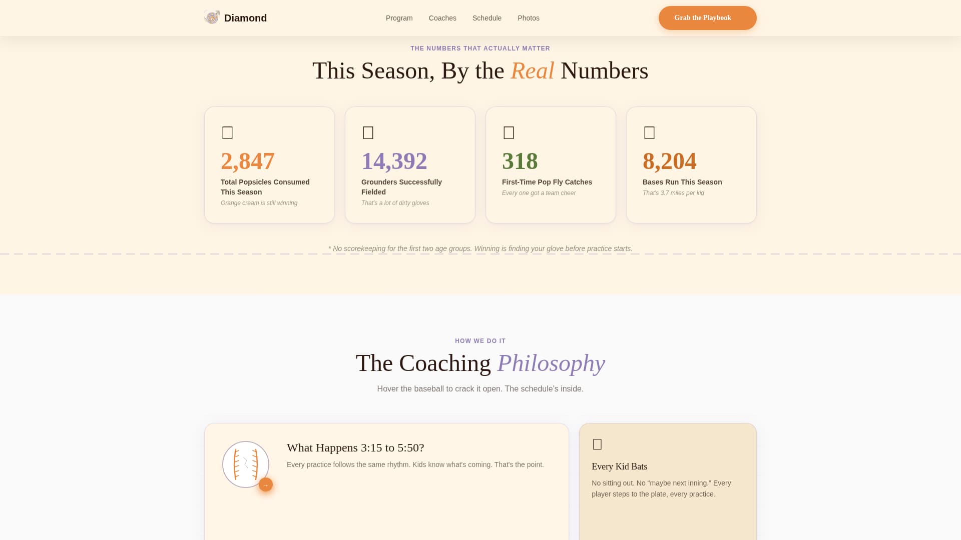 In the coaching philosophy section, hovering over an illustrated baseball cracks it open to display the daily practice schedule. This interaction reveals practical information inside a moment of delight, keeping the page useful without feeling like a brochure.