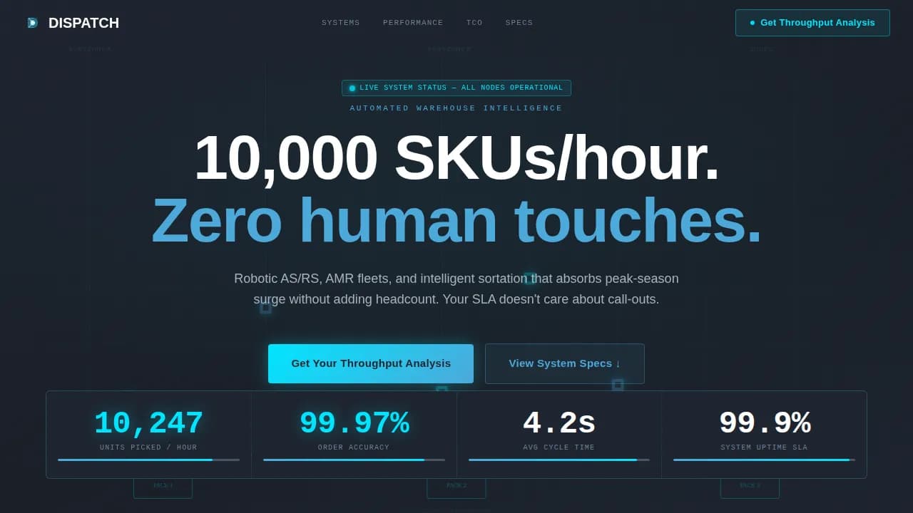 Dispatch is a single-page, dashboard-style landing page template designed for automated warehouse solutions providers. It uses a dark ops-floor visual identity, animated infographic header, and engineer-style spec card grids to present subsystem data clearly. The template drives lead generation through a focused throughput analysis form and a secondary PDF download path.