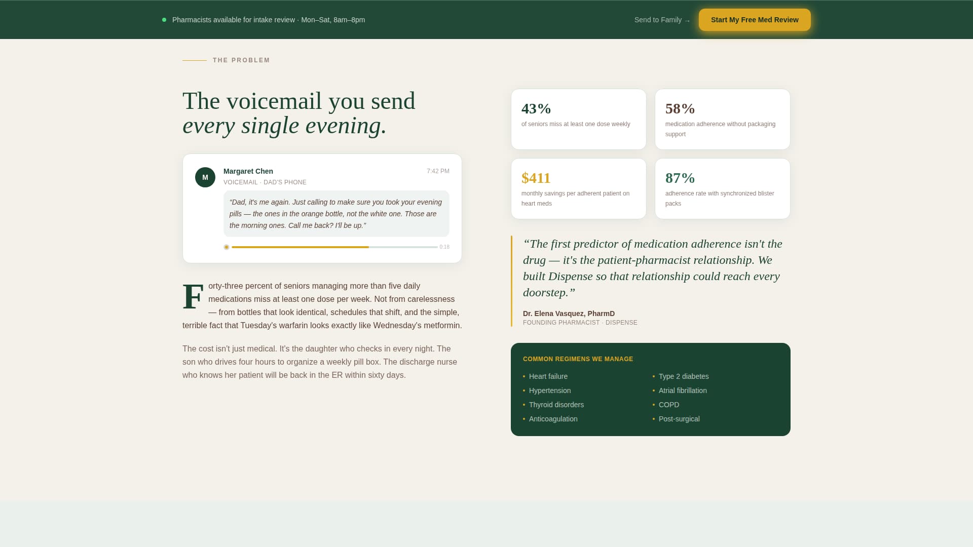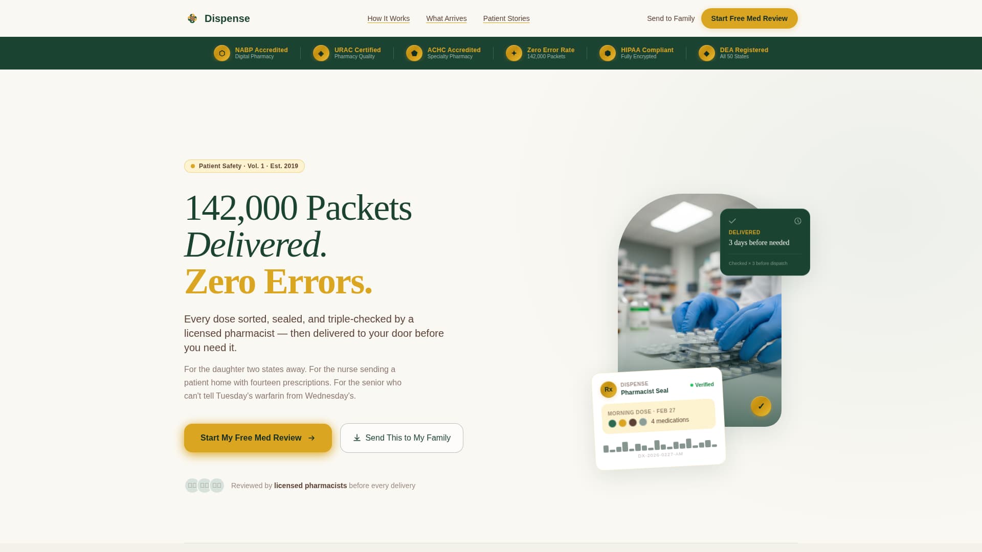 Dispense is an editorial-style medication management landing page built for pharmacy services that sort, seal, and deliver daily medication packets. Anchored in a Civic Service theme with a Forest Trust color palette, it leads with accreditation badges, a conviction-driven narrative, and a single clear call to action, "Start My Free Med Review", designed to move cautious, high-trust audiences toward enrollment.
