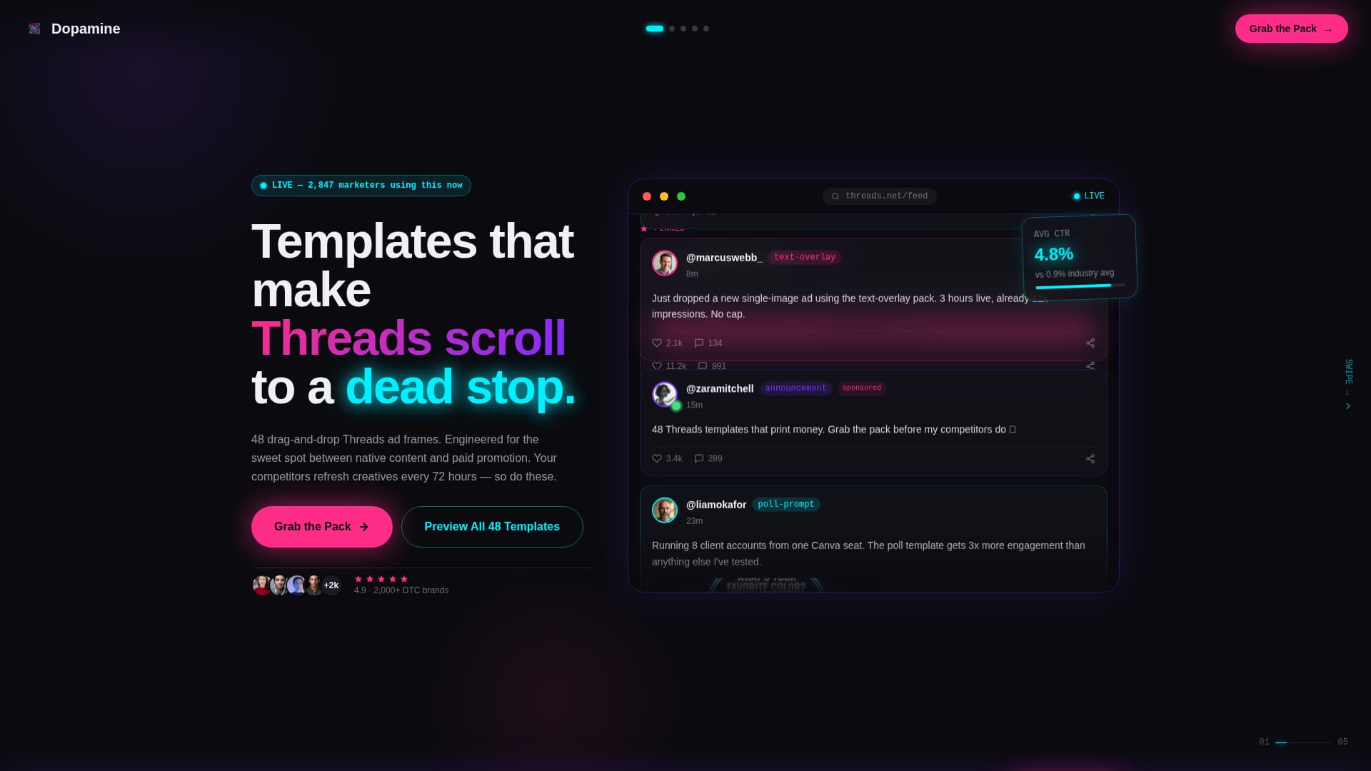 Dopamine is a horizontal scroll landing page template built for Threads ad creative packs. It pairs a live-scrolling mock feed header with five cinematic panels, a pulsing "Grab the Pack" call to action, and a Futuristic Neon color system. Designed for growth marketers, freelance strategists, and startup founders who need scroll-stopping creatives ready to launch fast.