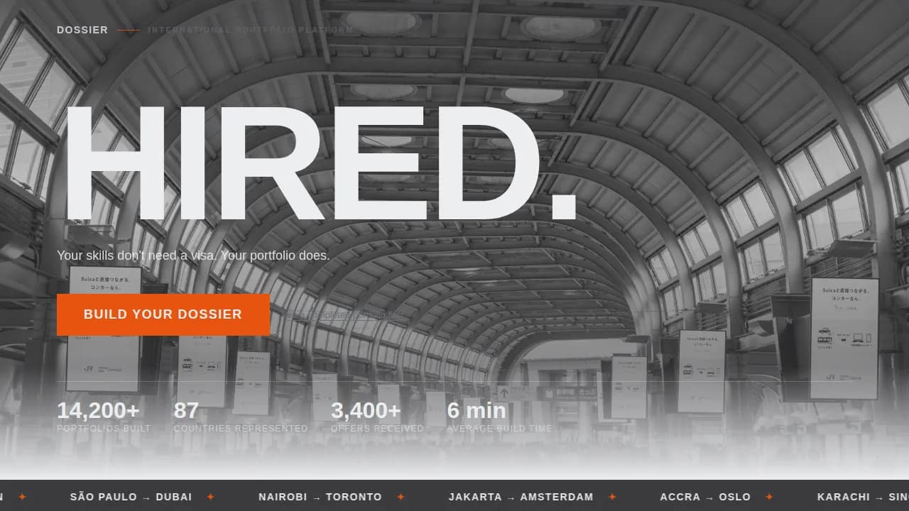 Dossier is a bold brutalist international job seeker portfolio landing page template built for cross-border candidates who need to make an instant impression. It combines a masonry grid of success stories, oversized high-contrast typography, and a signal-orange call to action into one relentless, scroll-driven page that turns foreign credentials into undeniable proof of ability.