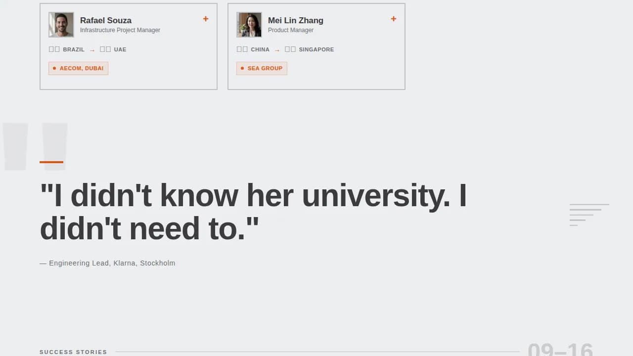 The core of the site is a staggered masonry grid of portfolio cards. Each card shows a headshot, home country flag, job title landed, and hiring country flag. The grid is arranged at varied heights, echoing the raw energy of a wheat-pasted wall. Visitors scroll through row after row of real success, and the sheer density of the collection becomes the argument. Brutalist layouts thrive on high-density content, and this grid is designed to do exactly that.