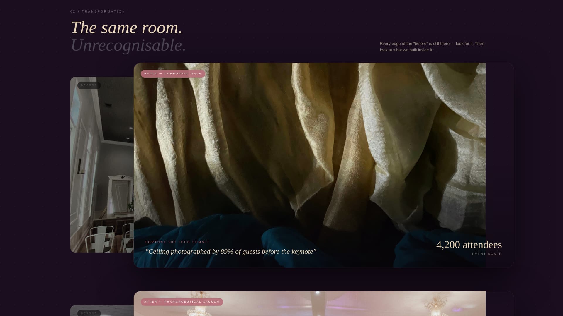 Raw venue photos sit beneath transformed results that overlap them by seventy percent. The untouched "before" state peeks out at the edges, making the transformation impossible to ignore without a single word of explanation.