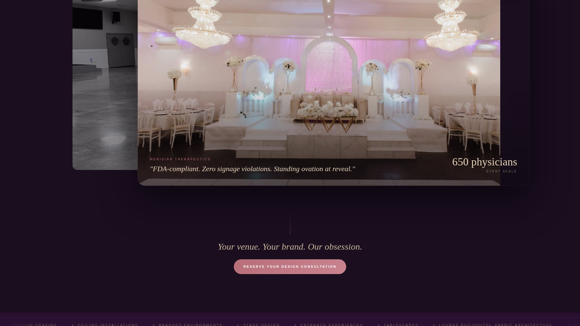 Drape is a single-page, overlap-layered landing page template for luxury conference event decoration studios. It uses a deep aubergine and champagne palette, cinematic lifestyle photography, and scroll-driven panel layering to guide corporate event planners from first impression to consultation booking. The design proves spatial transformation visually before asking for any information.