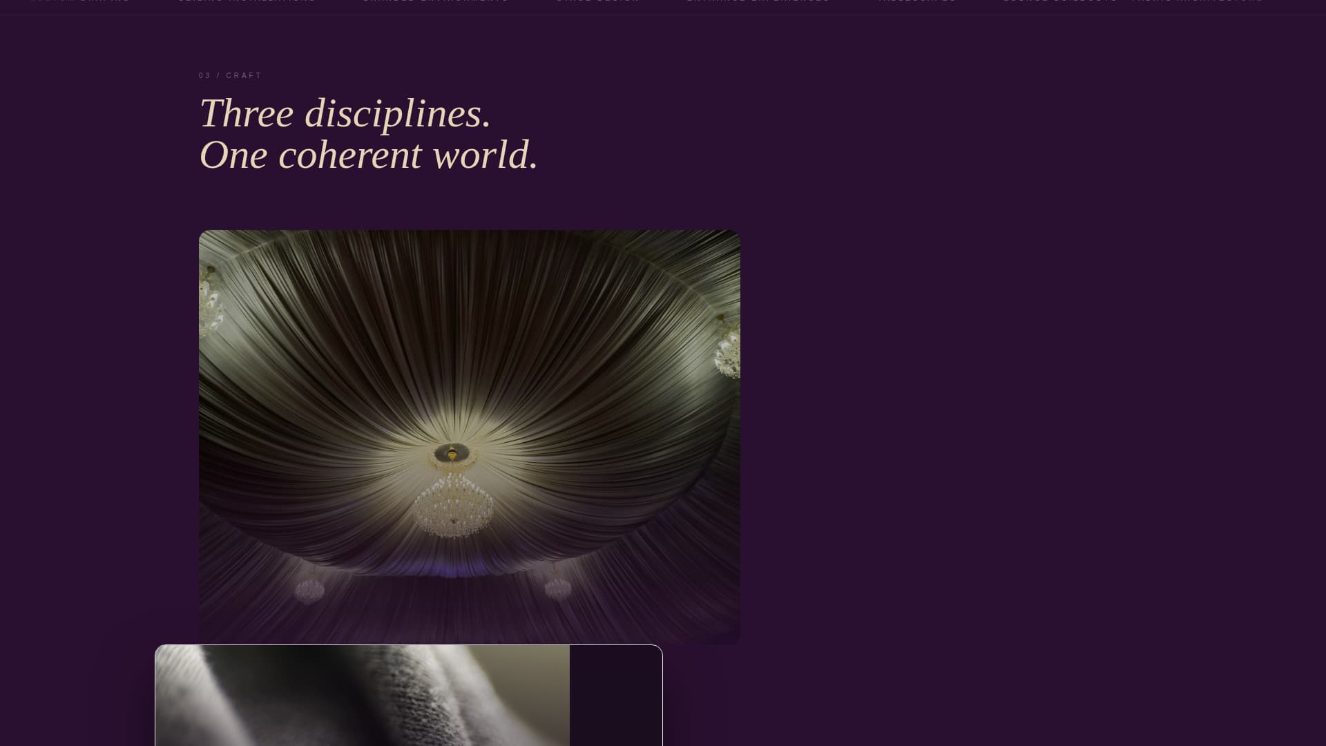 | Capabilities Texture | Layers close-up fabric, light, and floral textures over wide installation shots |