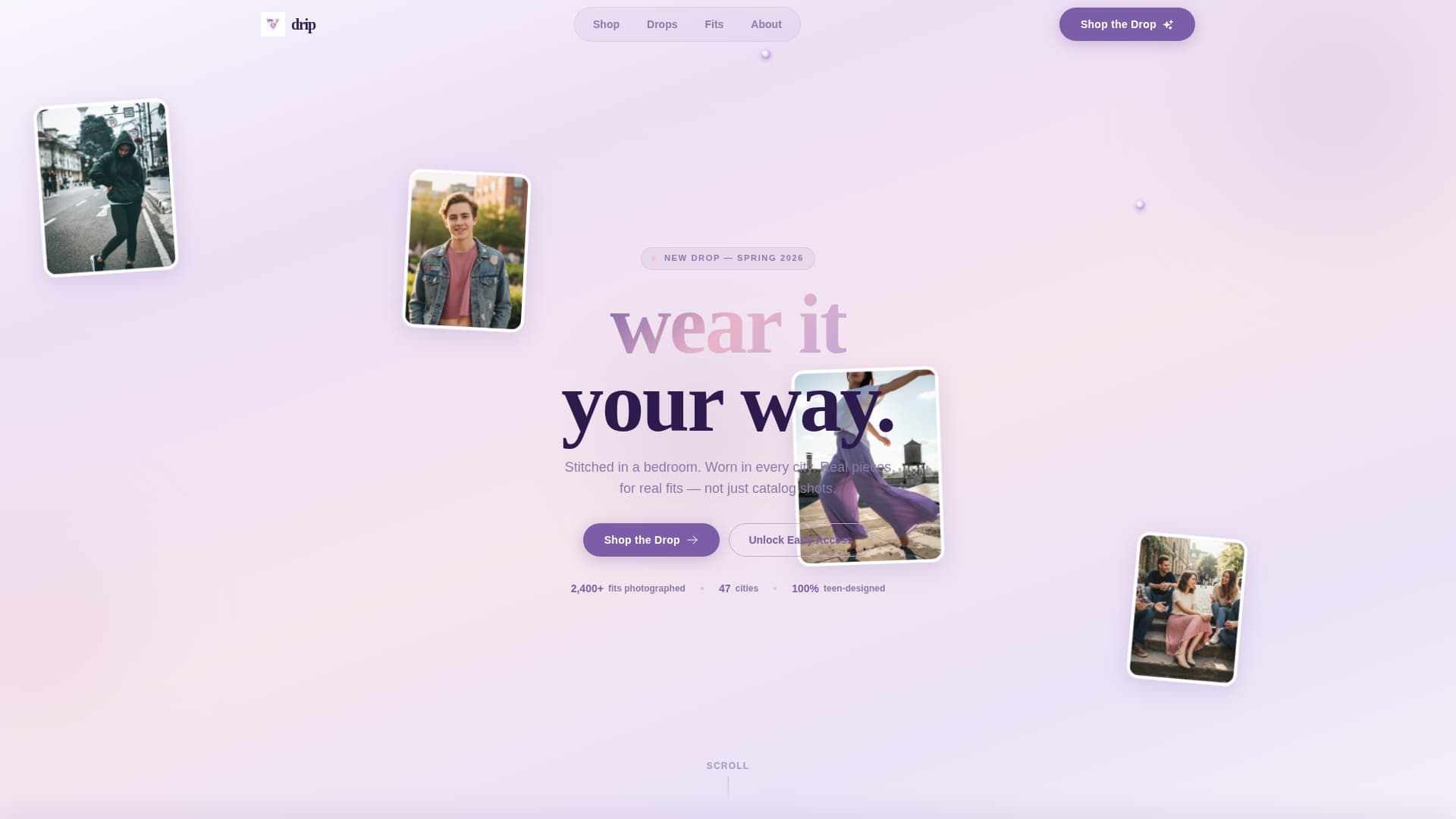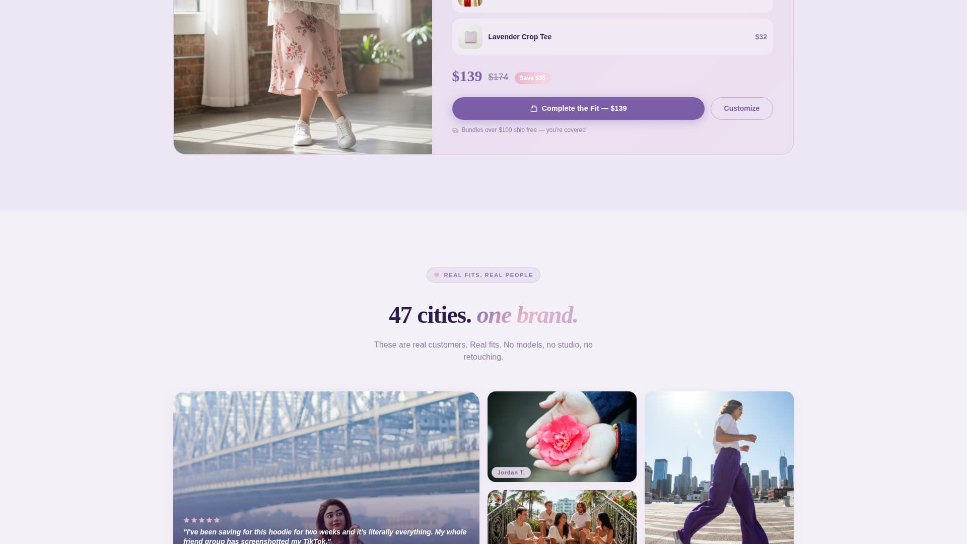 Drip is a single-page streetwear landing page template designed for youth-founded clothing labels. It blends a hazy lavender color system with real customer photo displays and flip-reveal gallery cards. Every section builds toward a purchase, from the first scroll to the sticky upsell bar at the bottom.