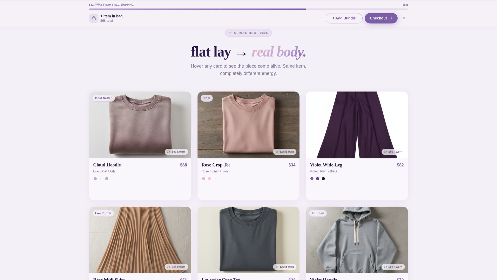| Before/After Gallery | Shows each piece as both a product and a lived-in outfit |