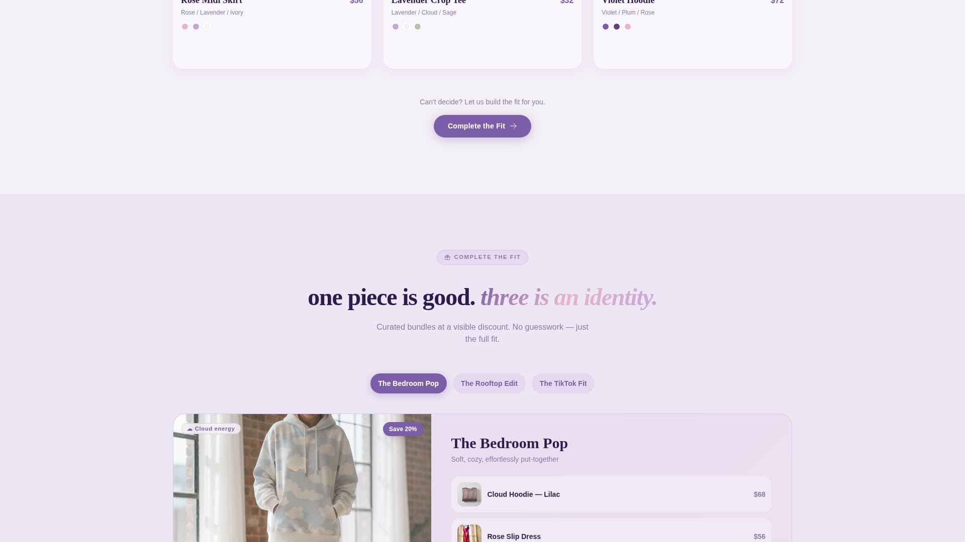| Styled Bundle Section | Groups pieces into full outfit identities with combined pricing |