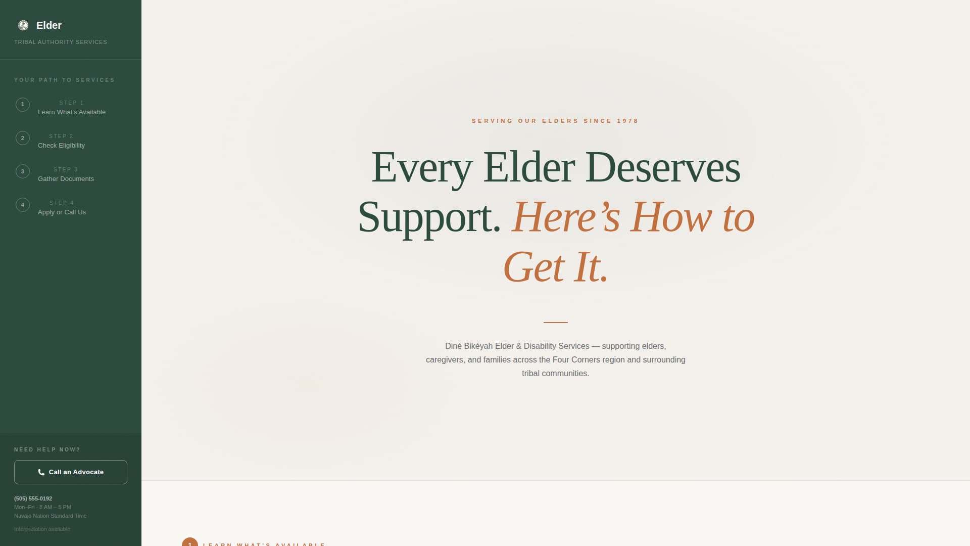 Elder is a sidebar companion landing page template for tribal authority aging and disability offices. It walks visitors through four clear steps, from learning what services exist to submitting an application or calling an advocate. The design is calm and civic, built for people who arrive with real, urgent questions and need plain-language answers before they take any action.