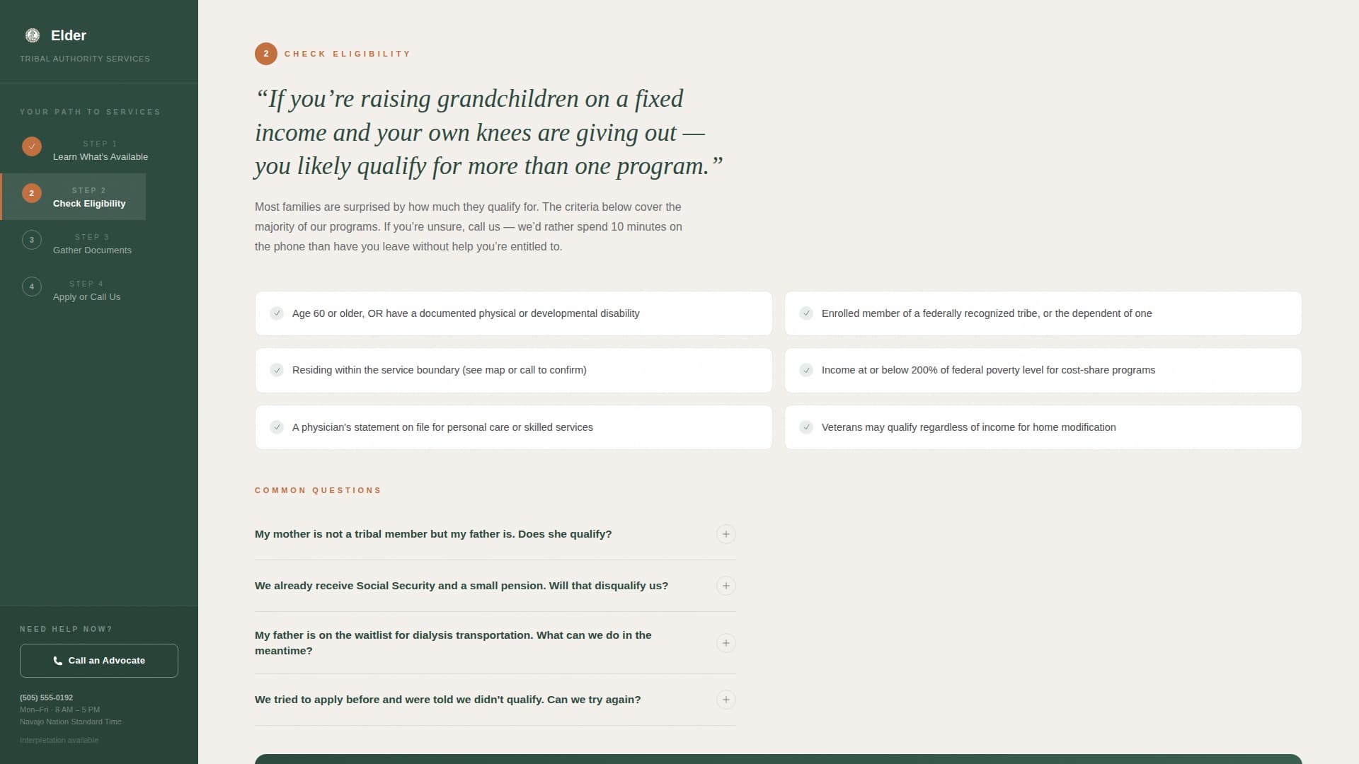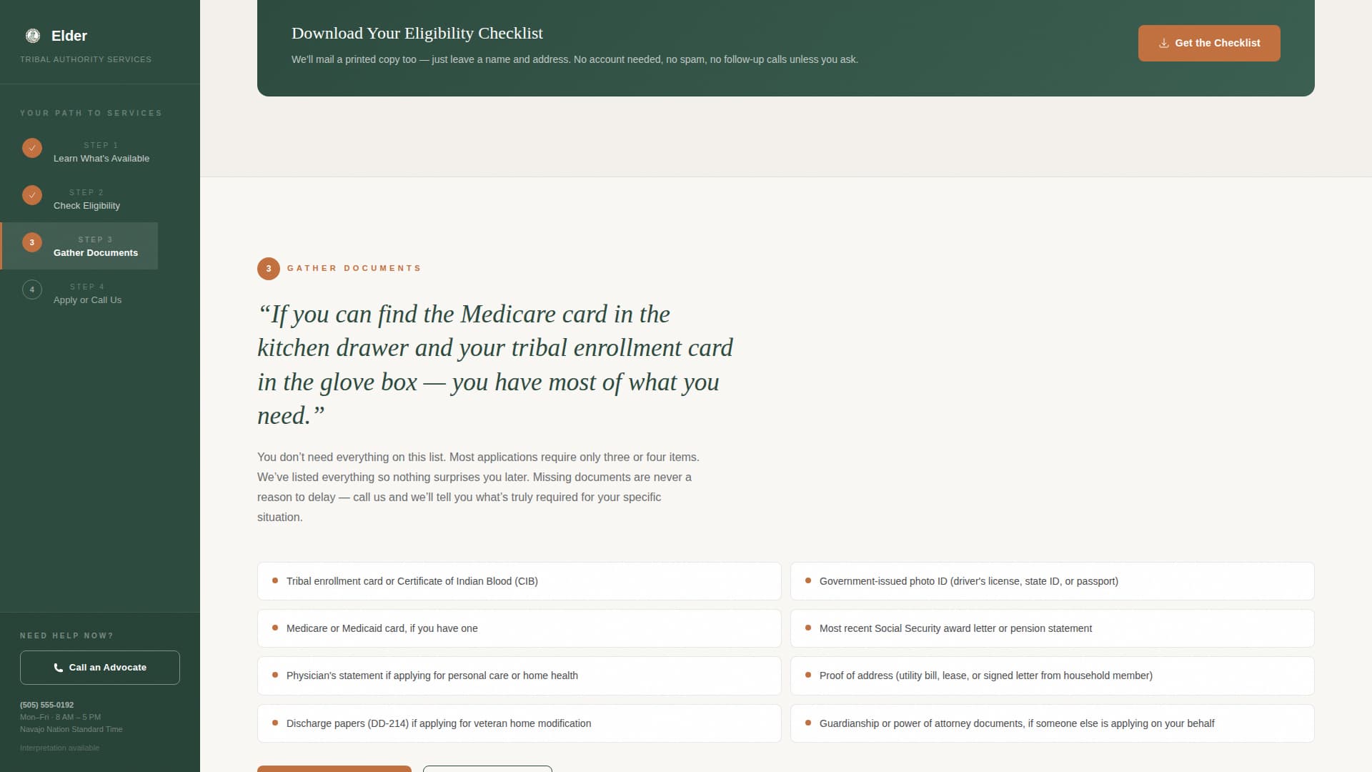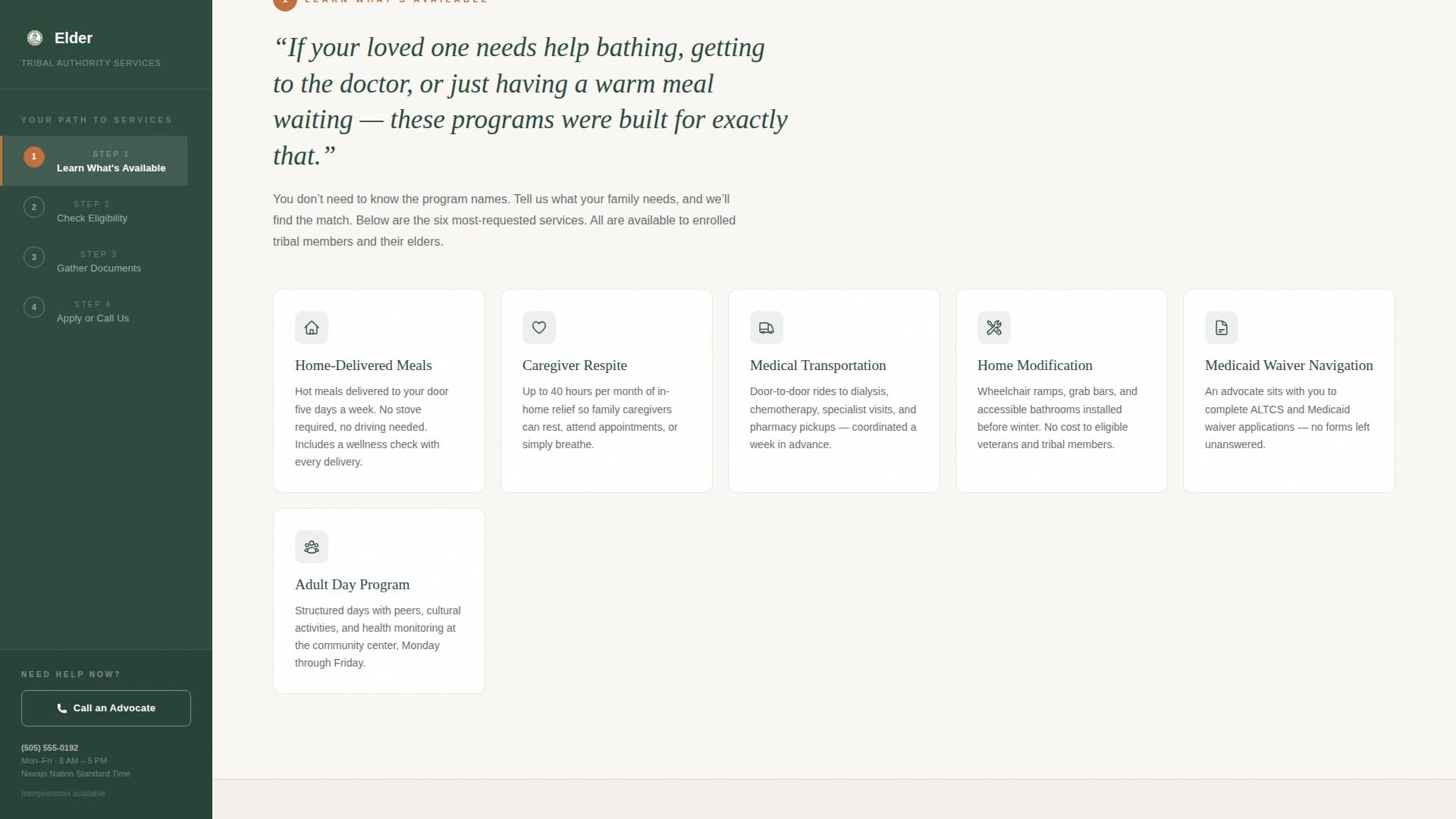 Tribal elder care programs are often complex, filled with program names, eligibility rules, and document requirements that feel impossible to untangle alone. Visitors arrive overwhelmed and leave without acting because no single page explains things clearly enough in one place.