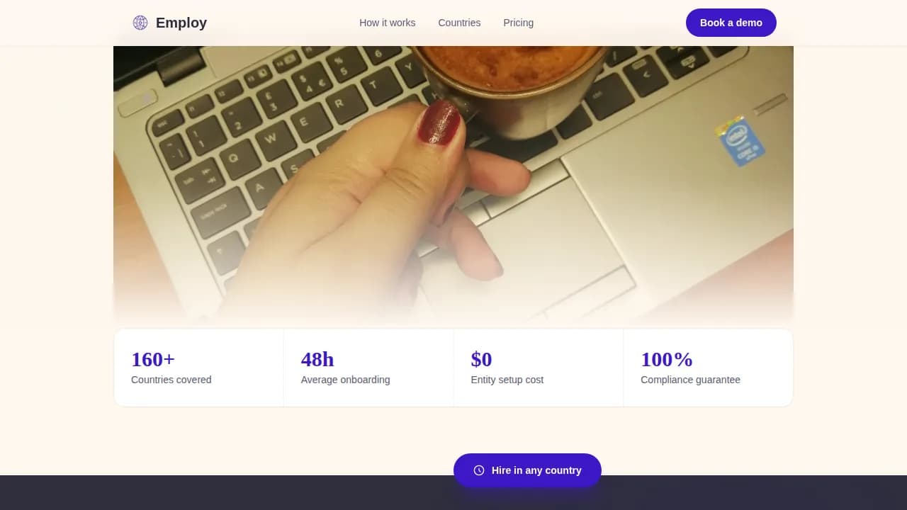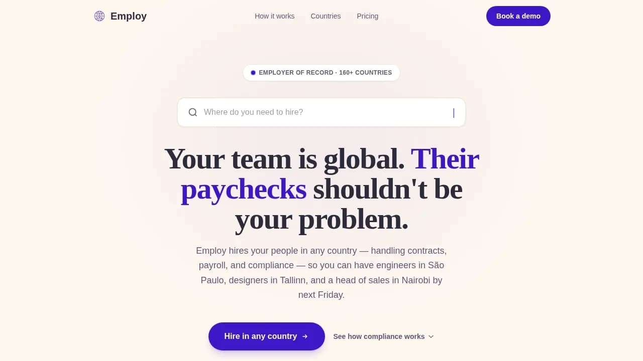 The Employ Global Hiring Compliance landing page template is a purpose-built, single-column landing page for Employer of Record services. It opens with a live country search box, moves through three emotionally resonant narrative acts, and closes with a world map and a persistent "Hire in Any Country" call-to-action. The design uses an Electric Indigo color system on a hearthlight cream background to create professional warmth.