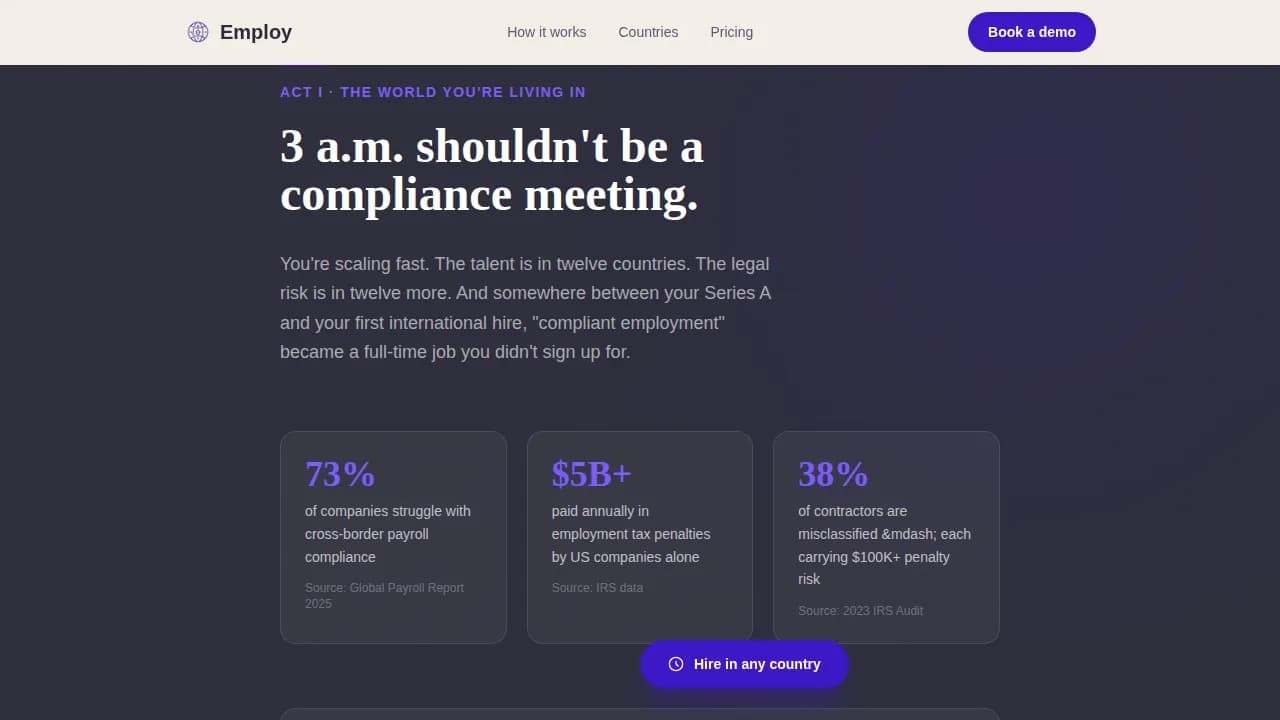 This landing page is designed for B2B teams selling global hiring and compliance services. It speaks directly to the people who feel the weight of international employment risk every day.