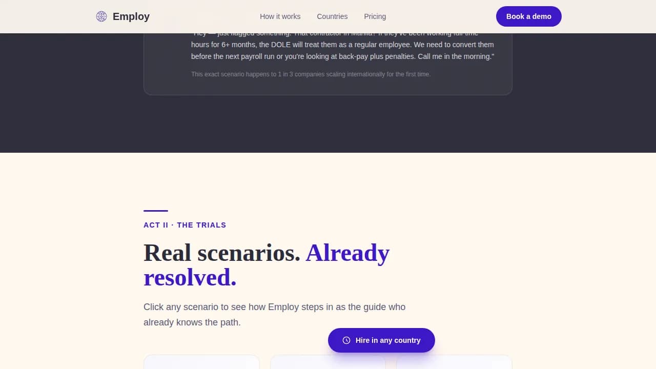 Three distinct scenario cards display real hiring crises: an offer letter needed in Germany by tomorrow, a contractor in India who should have been a full-time employee months ago, and a tax authority audit in France. Each card slides into a resolution showing the Employer of Record stepping in. These cards help candidates, potential applicants, and buyers understand the service through concrete jobs-to-be-done.