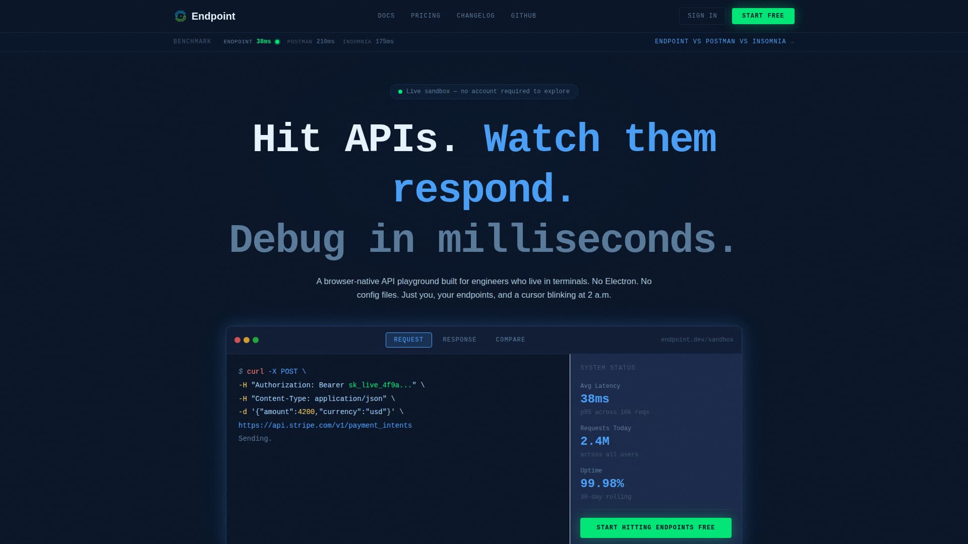 The header renders a live code block in a monospaced font against the void-dark navy background. The default tab shows a cURL command mid-flight with an animated ellipsis. Clicking "Response" snaps a syntax-highlighted JSON payload into view. Clicking "Compare" splits the block into two panes with latency numbers ticking in real time.
