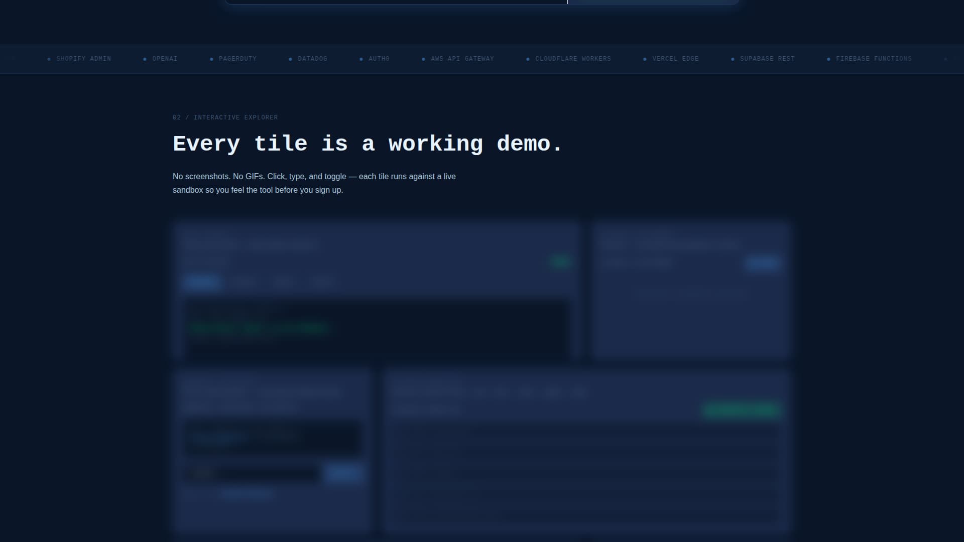 Each tile functions as a working micro-demo rather than a static screenshot. One tile lets visitors toggle authentication methods and watch the request header rewrite itself. Another tile is a latency histogram that populates with live data as visitors interact with it.