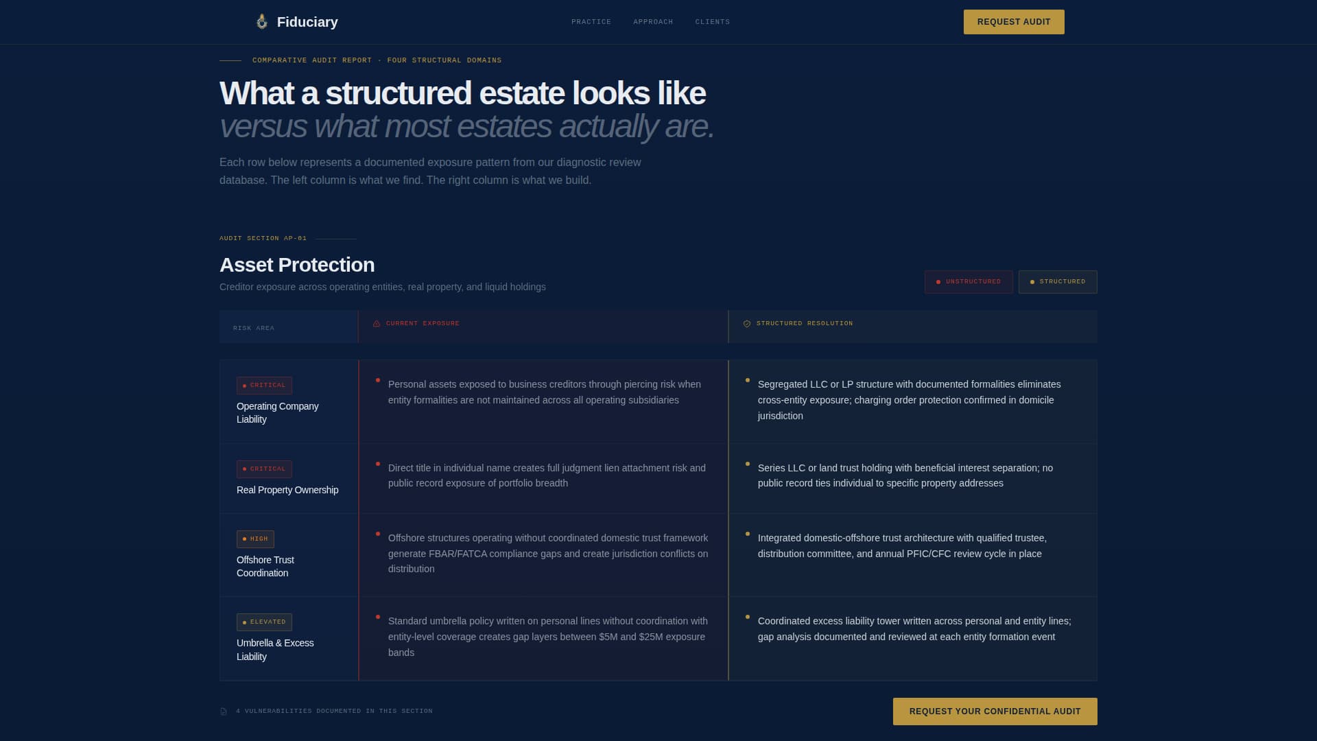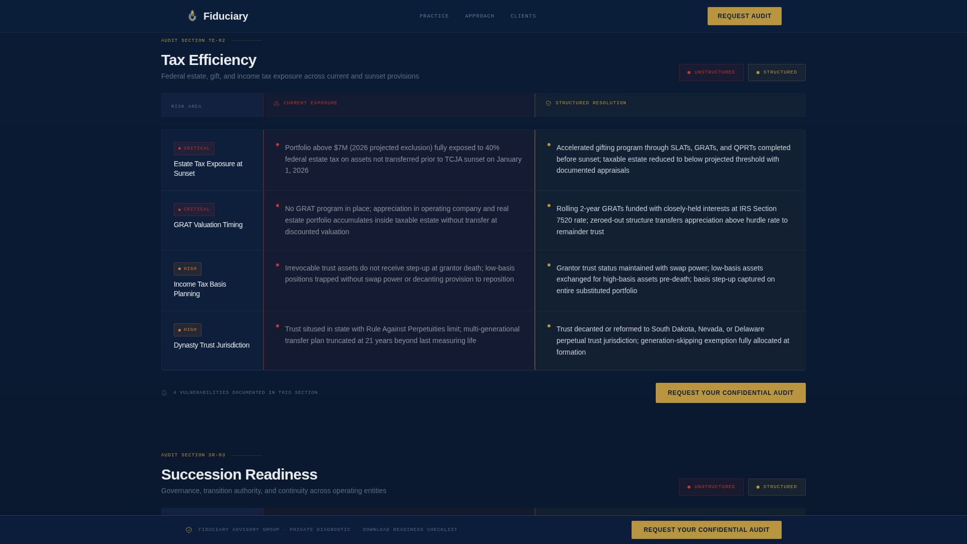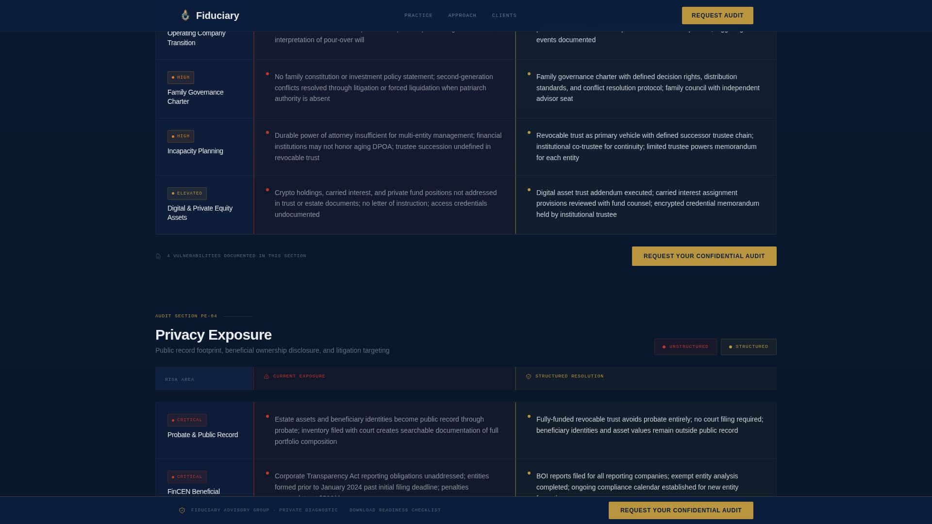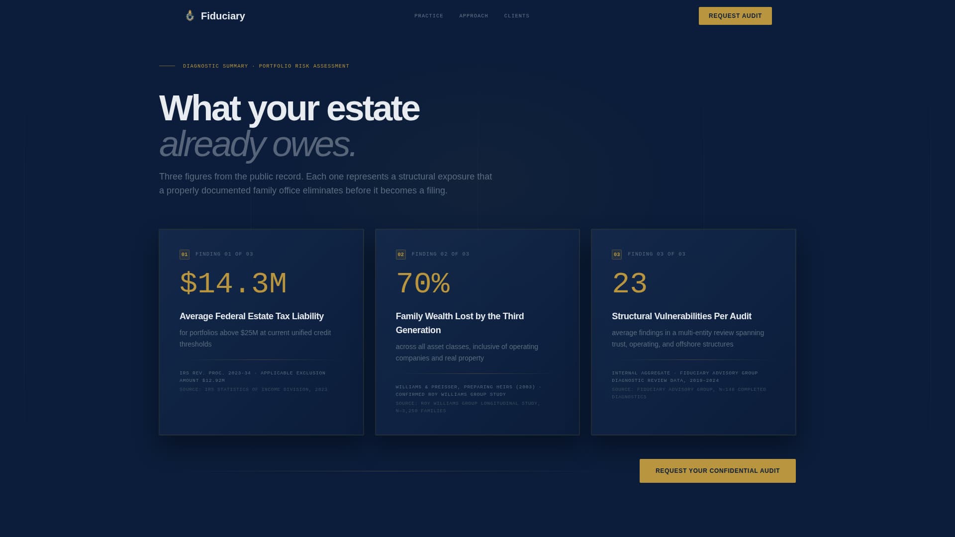 Fiduciary is a Click-Through landing page template for family office advisory and estate planning practices. It opens with three animated fear metrics, moves prospects through structured audit comparison tables, and closes with a single primary call to action: "Request Your Confidential Audit." No contact form appears on this page. The design is built to earn the click before asking for it.