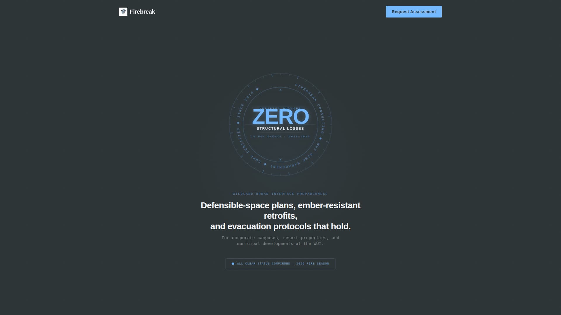 Firebreak is a focused, single-column landing page template designed for wildfire preparedness consultancies. It opens with a stamped guarantee badge, walks prospects through real-scale case studies, and closes with two clear conversion paths. The visual system uses deep charcoal, brushed graphite, and high-altitude sky blue to project the composure of a firm that has already done the hard work.