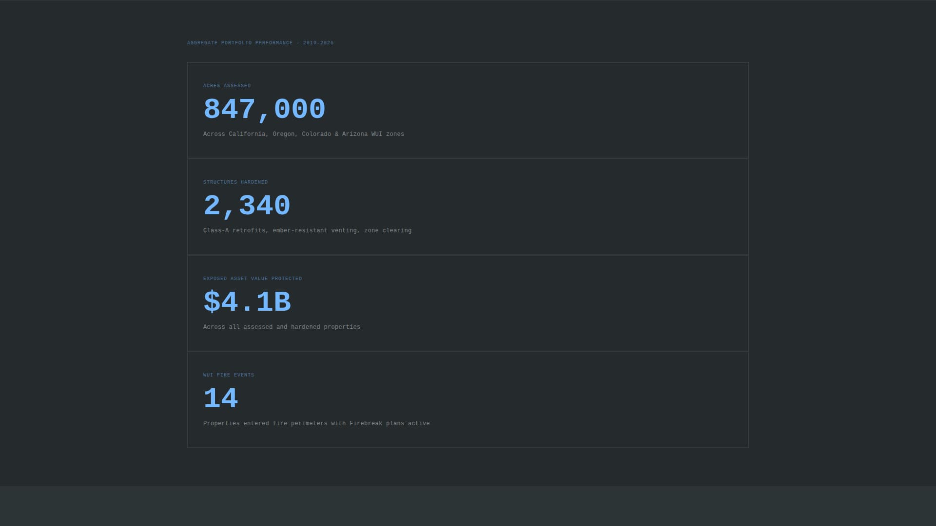 Between each case study, a full-width interstitial displays one hard number in sky blue text on a slate background. Examples include acres assessed, structures hardened, and total exposed asset value protected. These breaks give readers a moment to absorb scale before the next case builds on it.