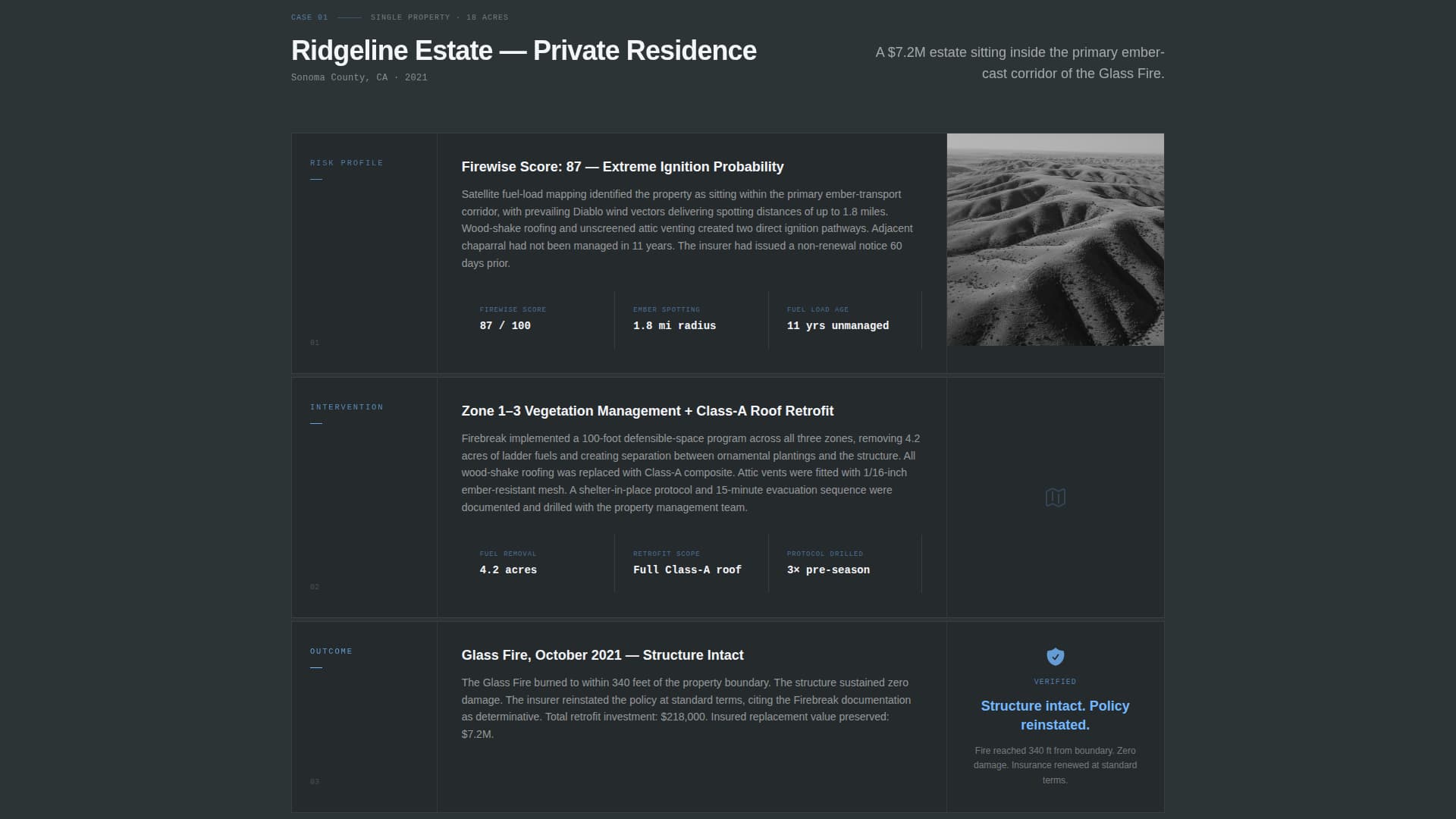 Three sequential case study sections each follow the same three-beat structure: risk profile, intervention, and outcome. The subjects scale from a single private estate to a sixty-unit homeowners association (HOA) to a full municipal district. This progression shows prospects that the methodology holds regardless of asset size.