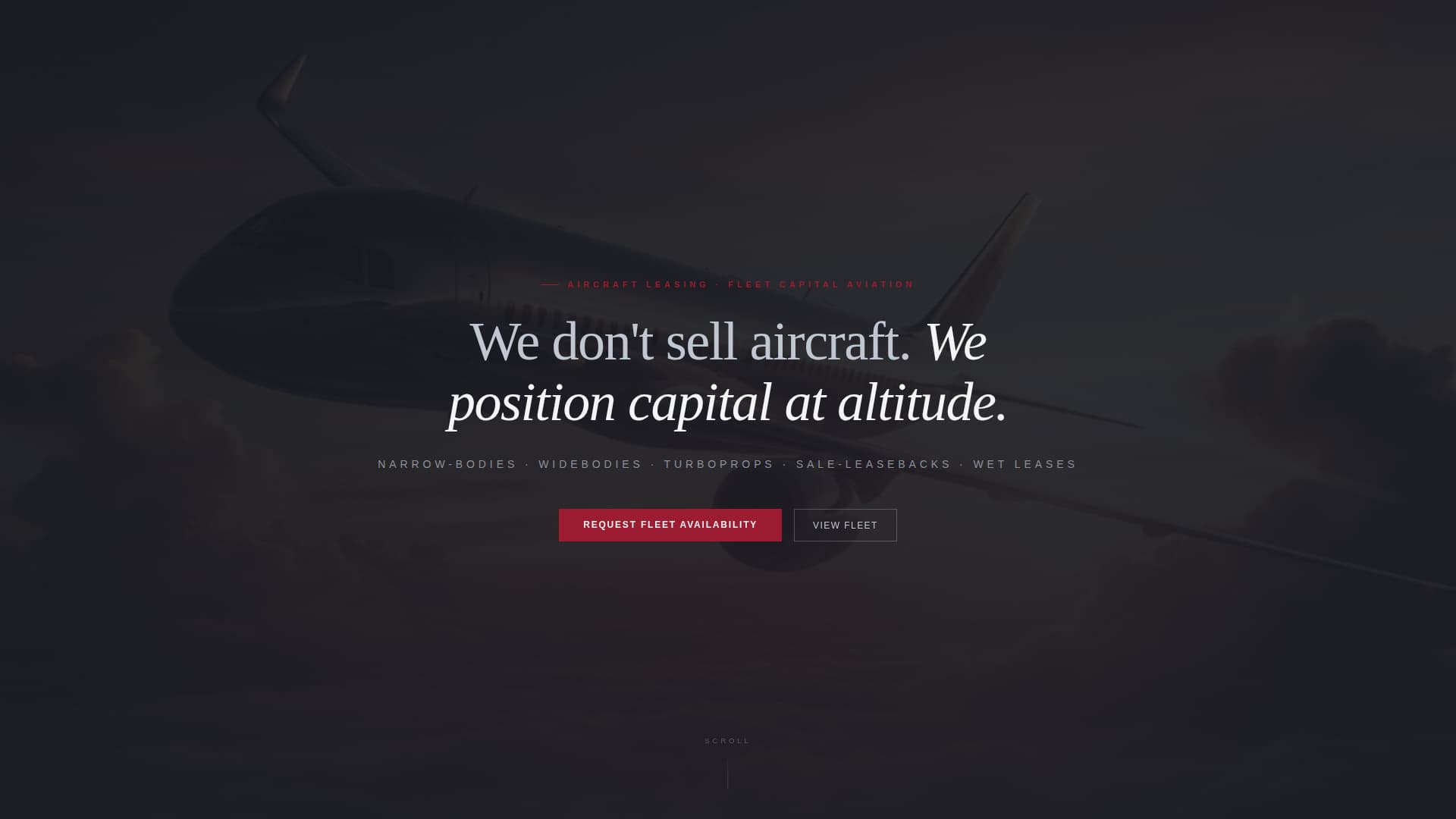 Aircraft leasing is a complex, trust-sensitive business. A generic web page cannot carry the weight of a multi-million-dollar transaction. The Fleet template solves the credibility gap by leading with cinematic hardware and deal process before ever presenting a form.