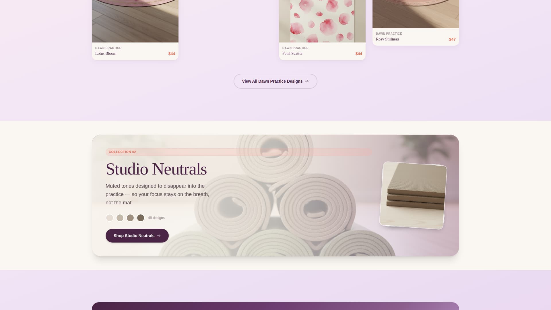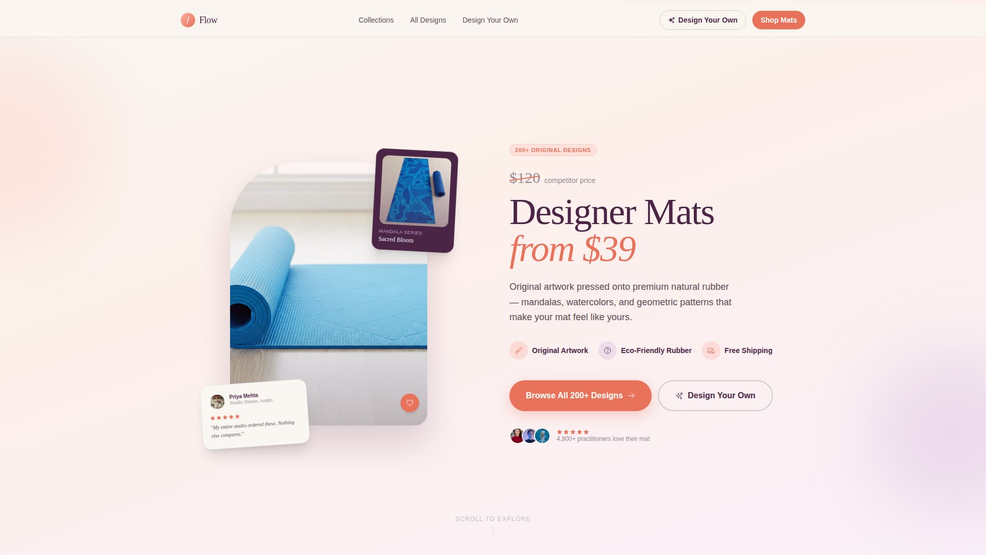 Most e-commerce landing pages treat yoga mats like commodity items. They show a flat product photo, list a price, and expect the visitor to connect. Flow solves the gap between "this looks nice online" and "I want this on my studio floor."