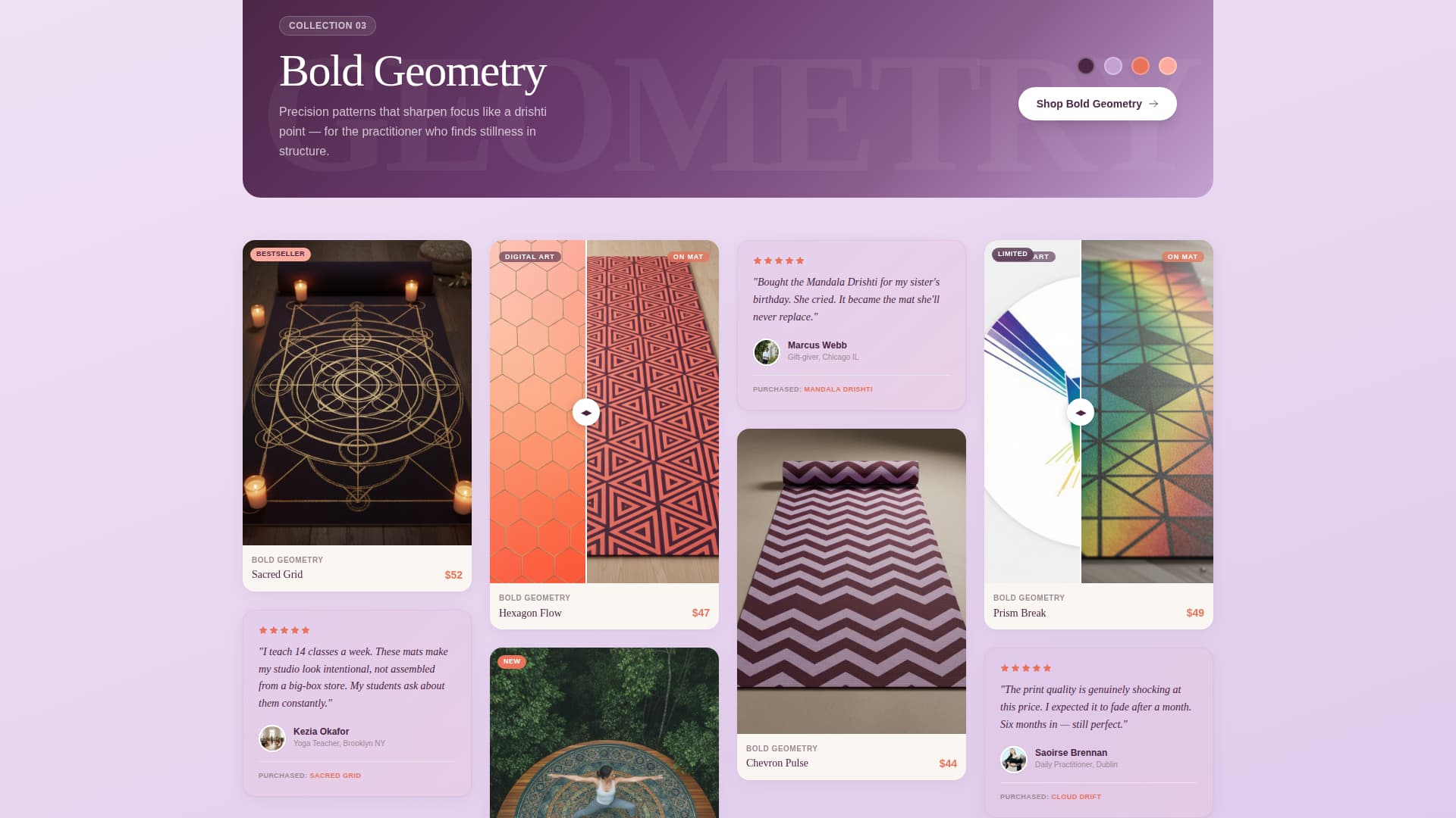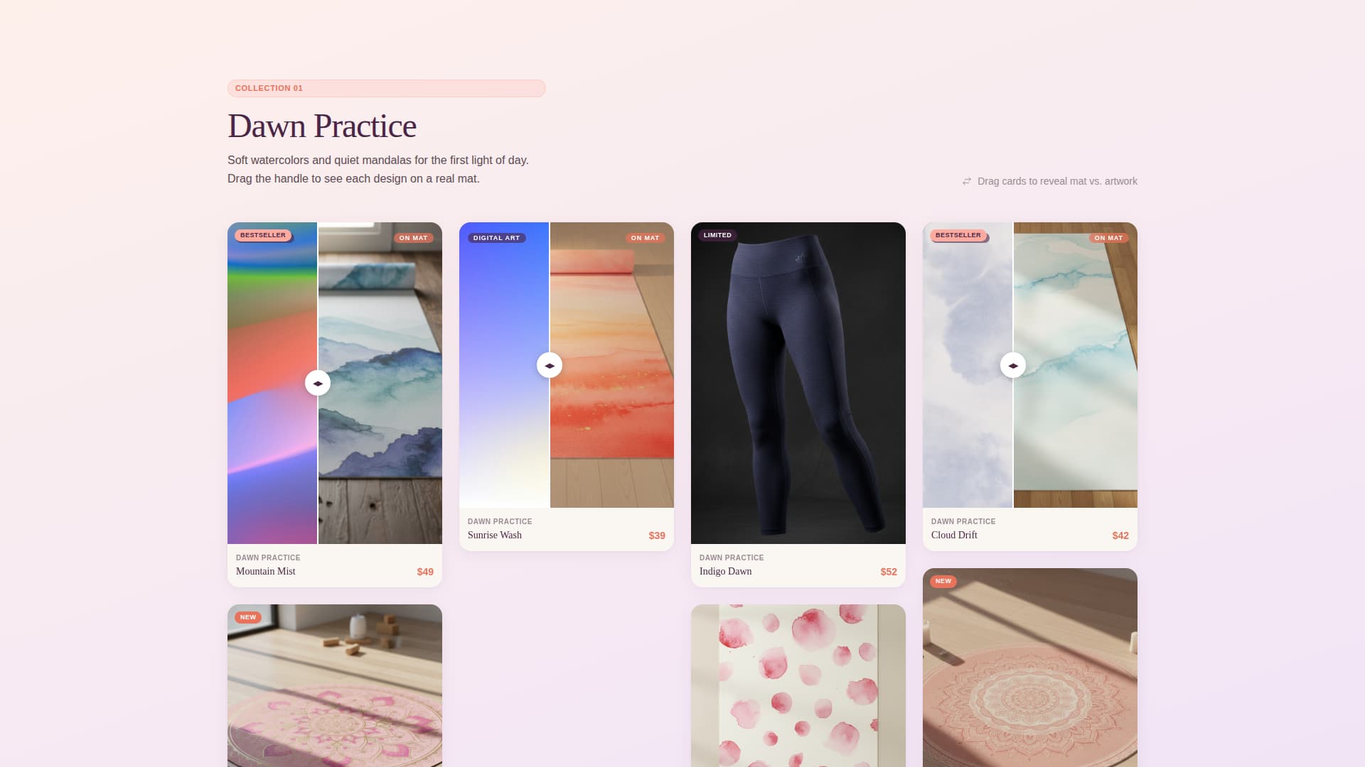 Flow is a masonry-grid landing page template built for print-on-demand yoga mat stores. It pairs a price-anchored hero with an interactive before-and-after product reveal, collection dividers, and a persistent mobile call-to-action bar. The warm sunset palette and card-grid layout turn original mat artwork into an experience that moves visitors straight to the product page.