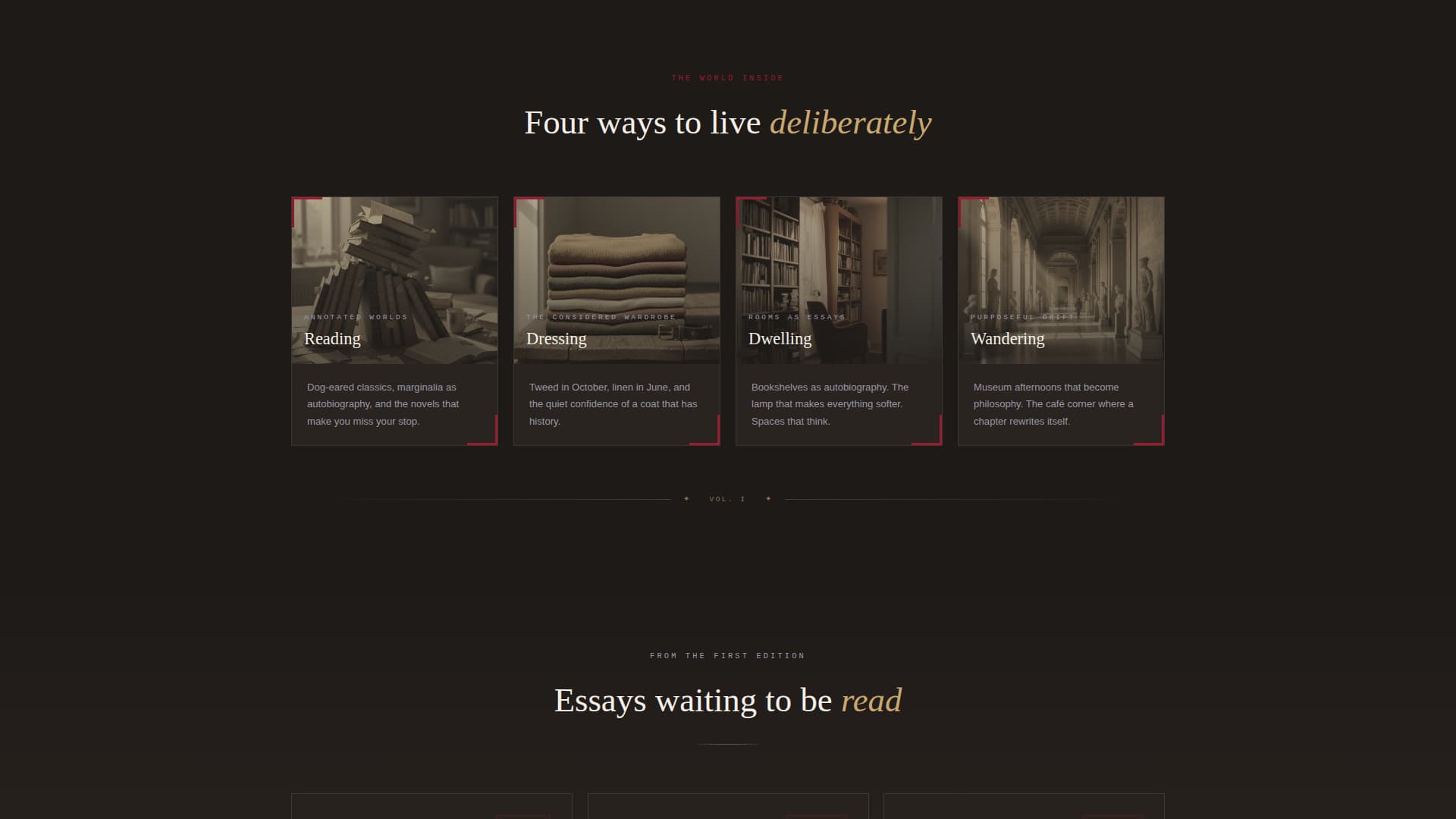 The first card row presents four sepia-toned content pillars: Reading, Dressing, Dwelling, and Wandering. Each card carries a ruby accent corner, anchoring the blog's thematic scope early and visually before a word of body copy is read.